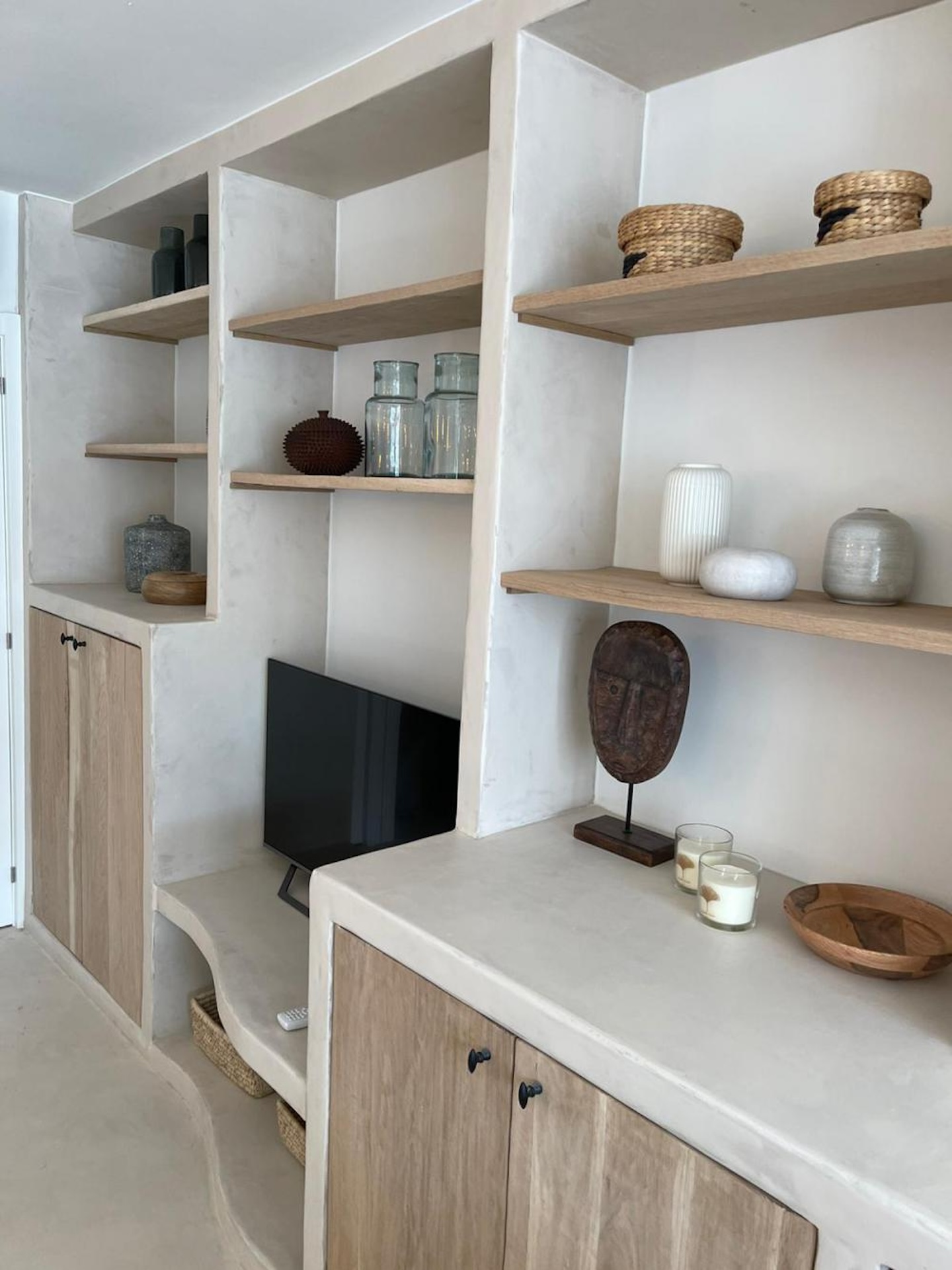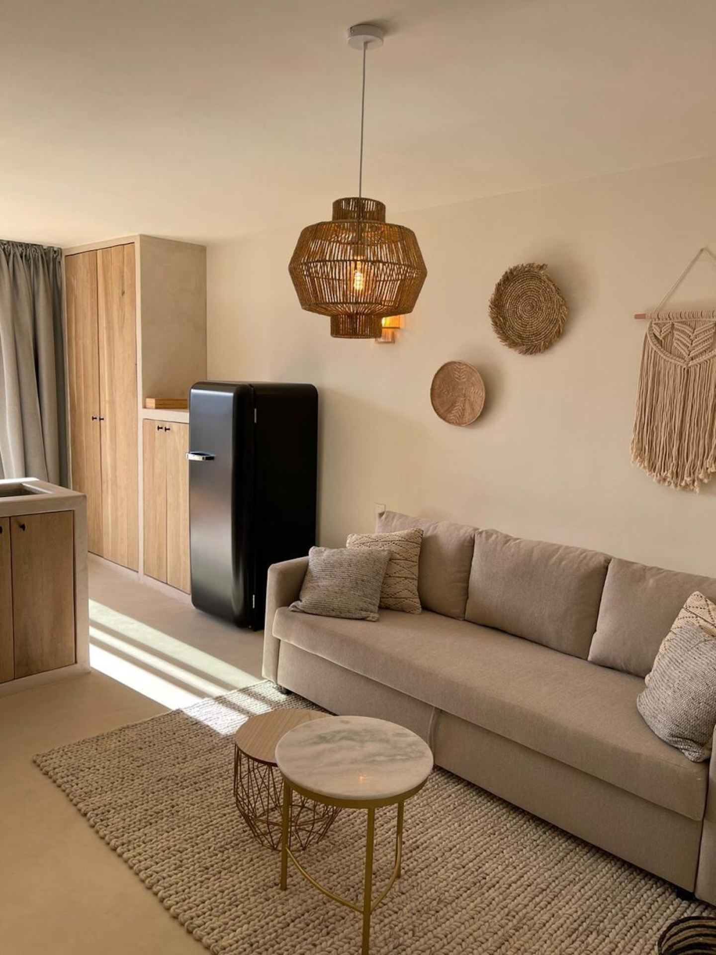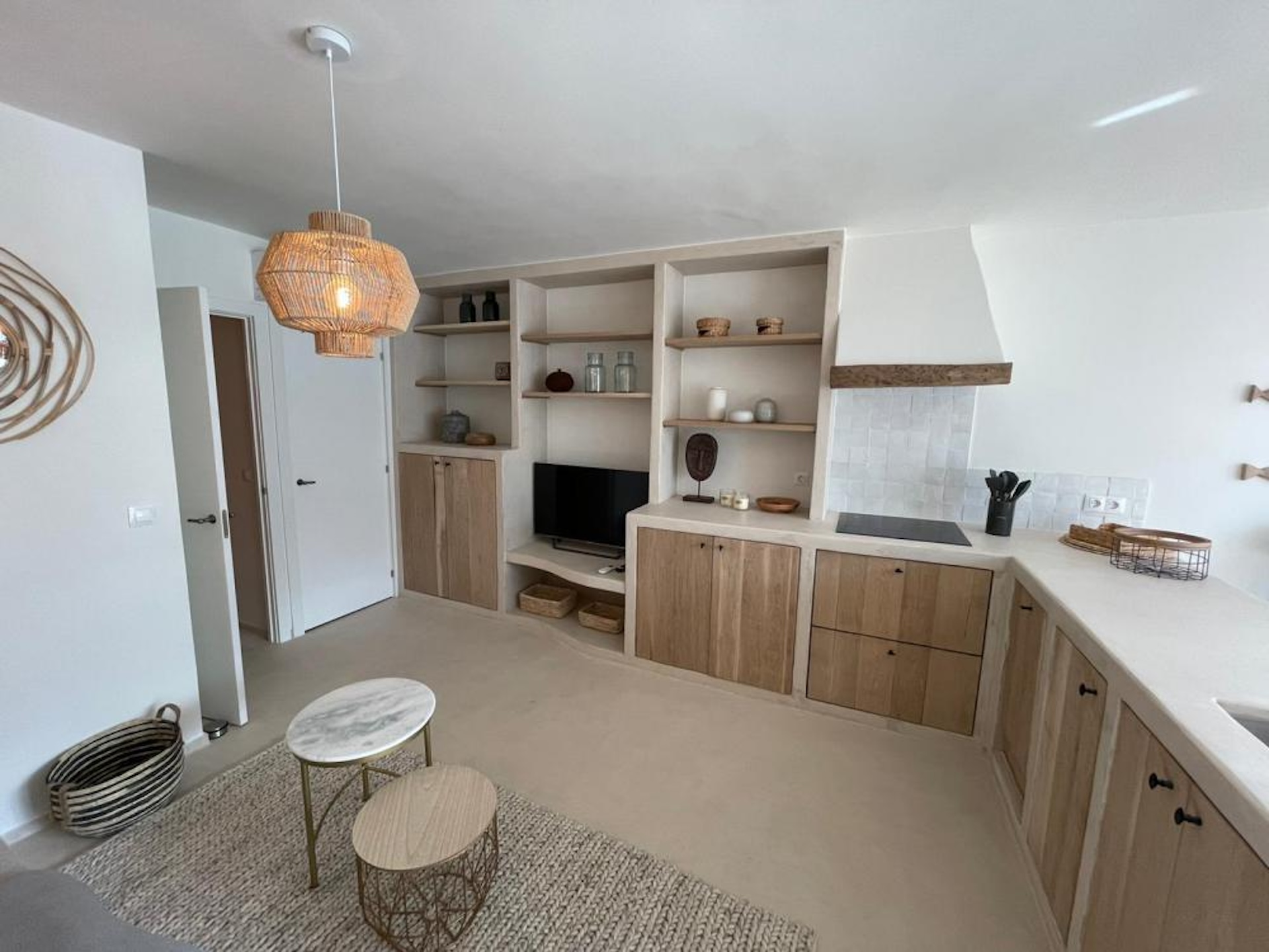 Binnen voelt alles rustig en chic tegelijk. Zachte zandtinten, warm hout, veel natuurlijke materialen en een elegante beach vibe. Alles klopt – van het linnen tot de verlichting, van de rieten details tot de zorgvuldig gekozen accessoires. De open leefruimte met keuken is licht en uitnodigend, de slaapkamer knus en comfortabel, de badkamer fris en modern. Airconditioning zorgt voor verkoeling op warme dagen…