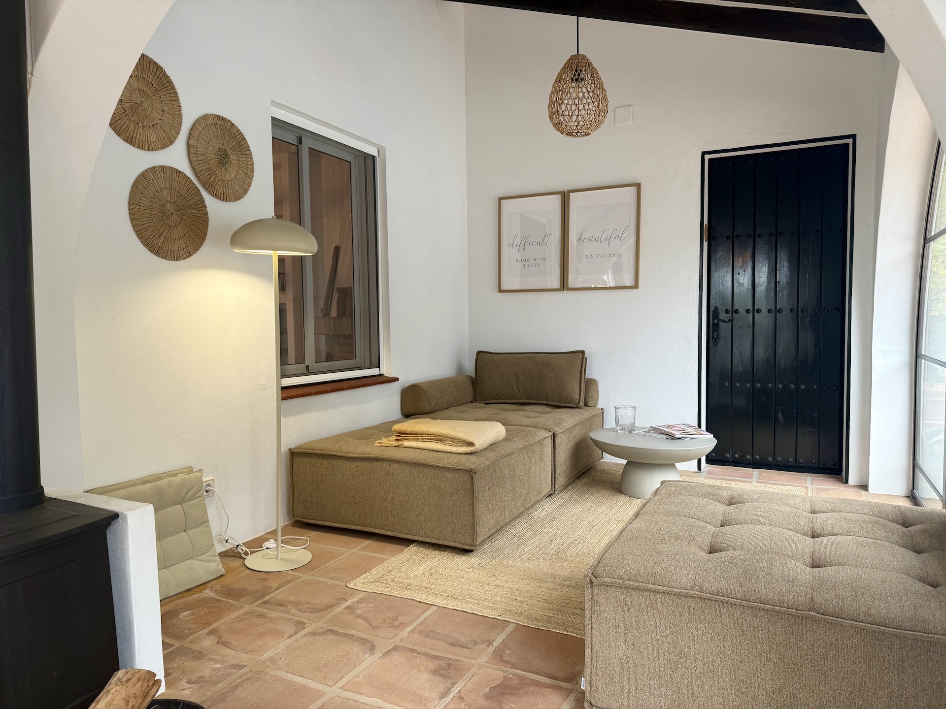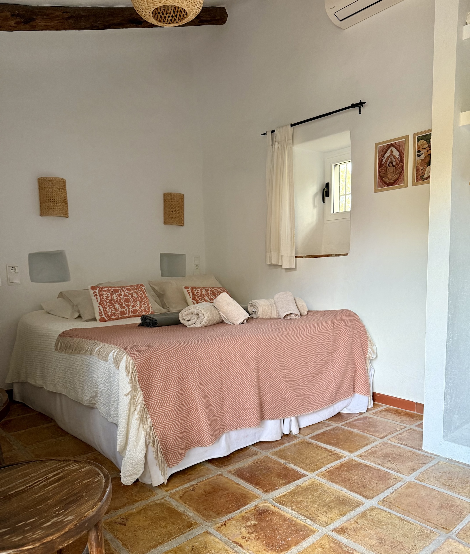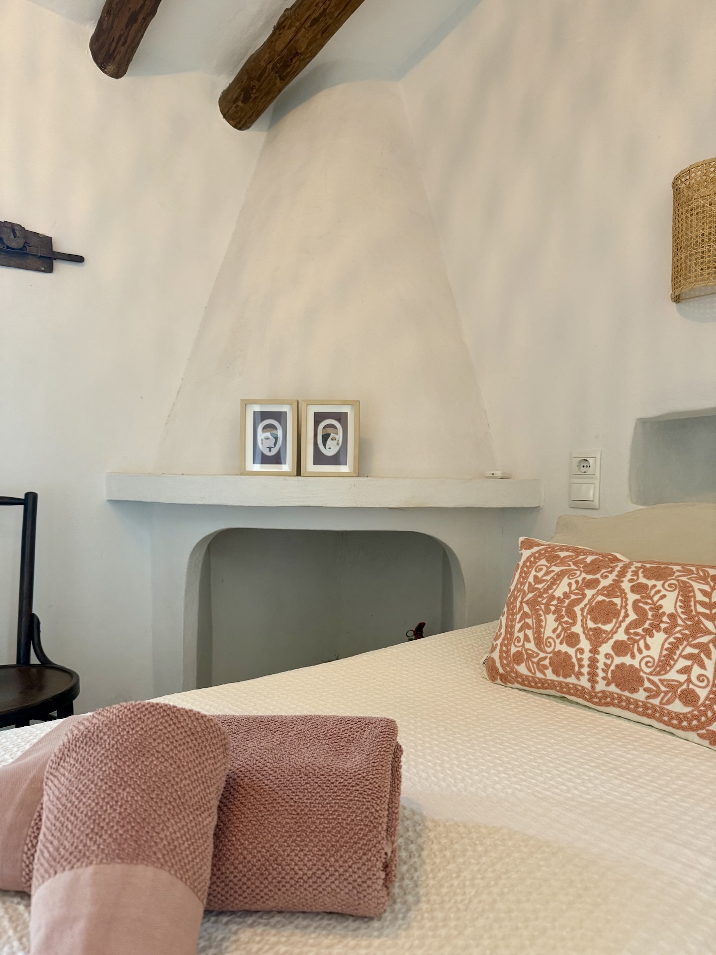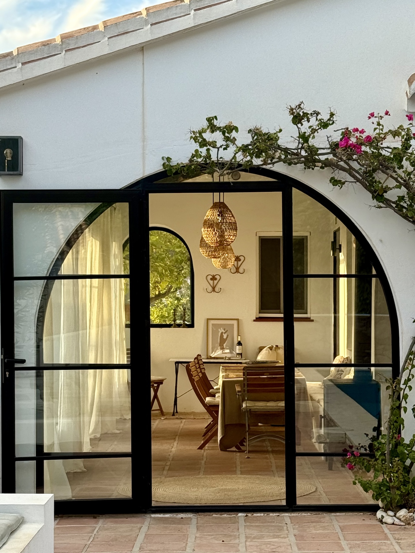 Casa Moum voelt meteen goed: authentiek en verfijnd tegelijk. Oude elementen en moderne lijnen lopen moeiteloos in elkaar over. Witte muren, terracotta vloeren, natuurlijke materialen en zwarte kozijnen die alles net dat beetje extra geven. Binnen is het licht en rustig, met warme tinten, zachte stoffen en hier en daar een vleug kleur – sfeervol, comfortabel en helemaal in balans.