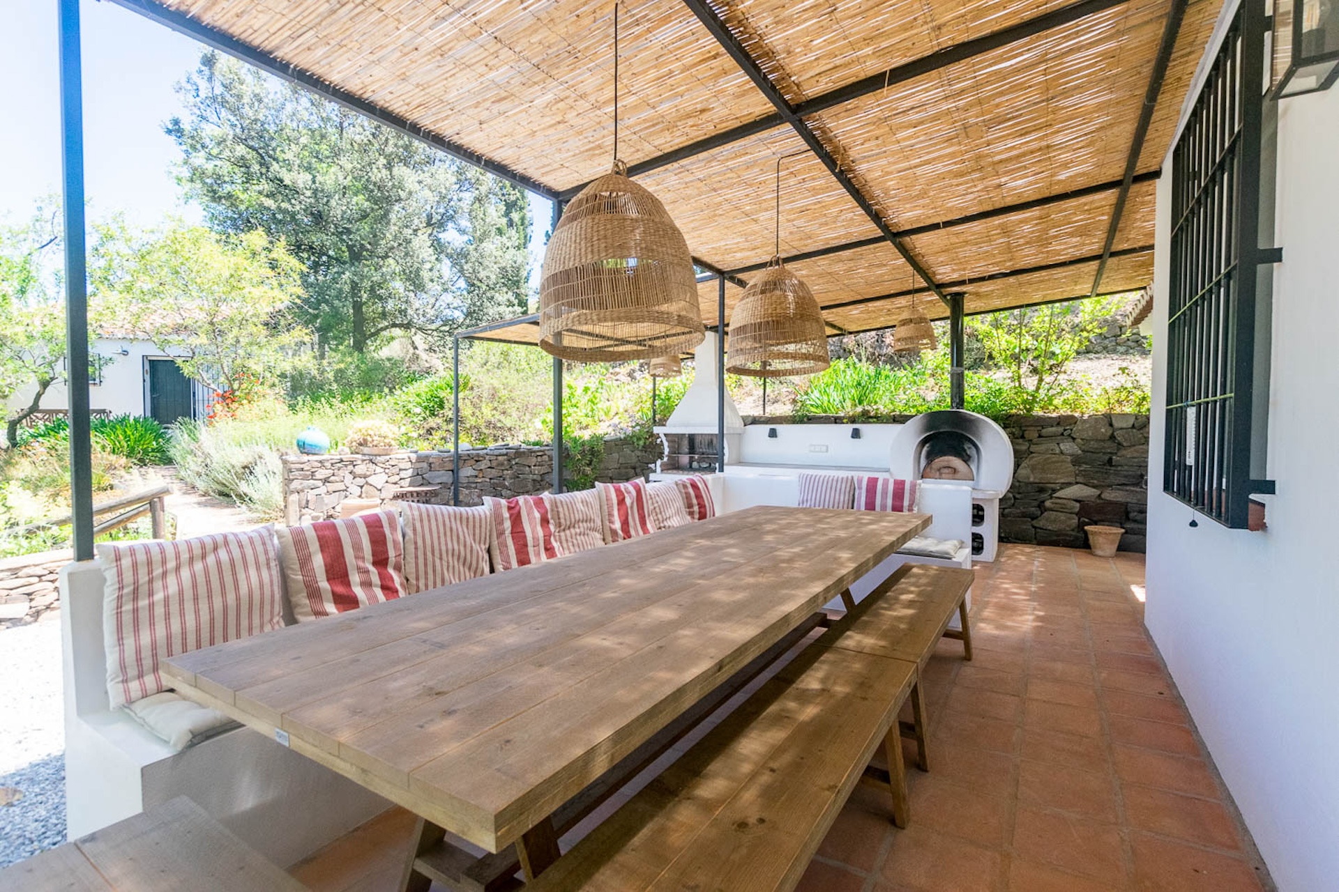 Het hoofdhuis is het hart van Casa Moum. Een fijne keuken waar je samen kookt, een eetkamer met grote ramen en een woonkamer met zithoek en houtkachels voor koelere avonden. De deuren staan open naar het terras met een extra lange tafel voor lunches en diners onder de sterren. Buiten wacht het extra grote zwembad (16x5m!) met lig- en zitplekken in de zon en schaduw. Hier wissel je zwemmen af met lezen, even bijkletsen en heerlijk nietsdoen.