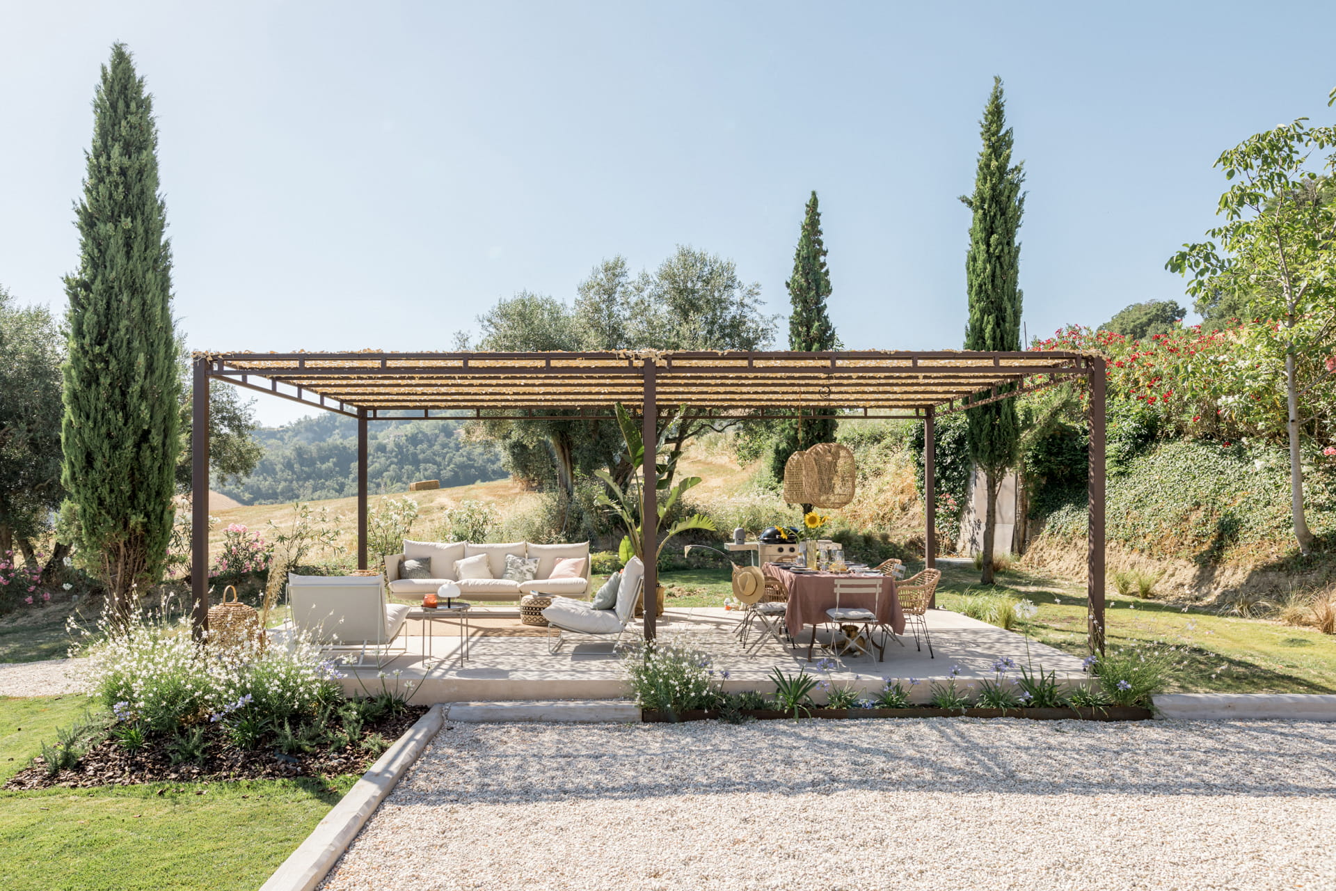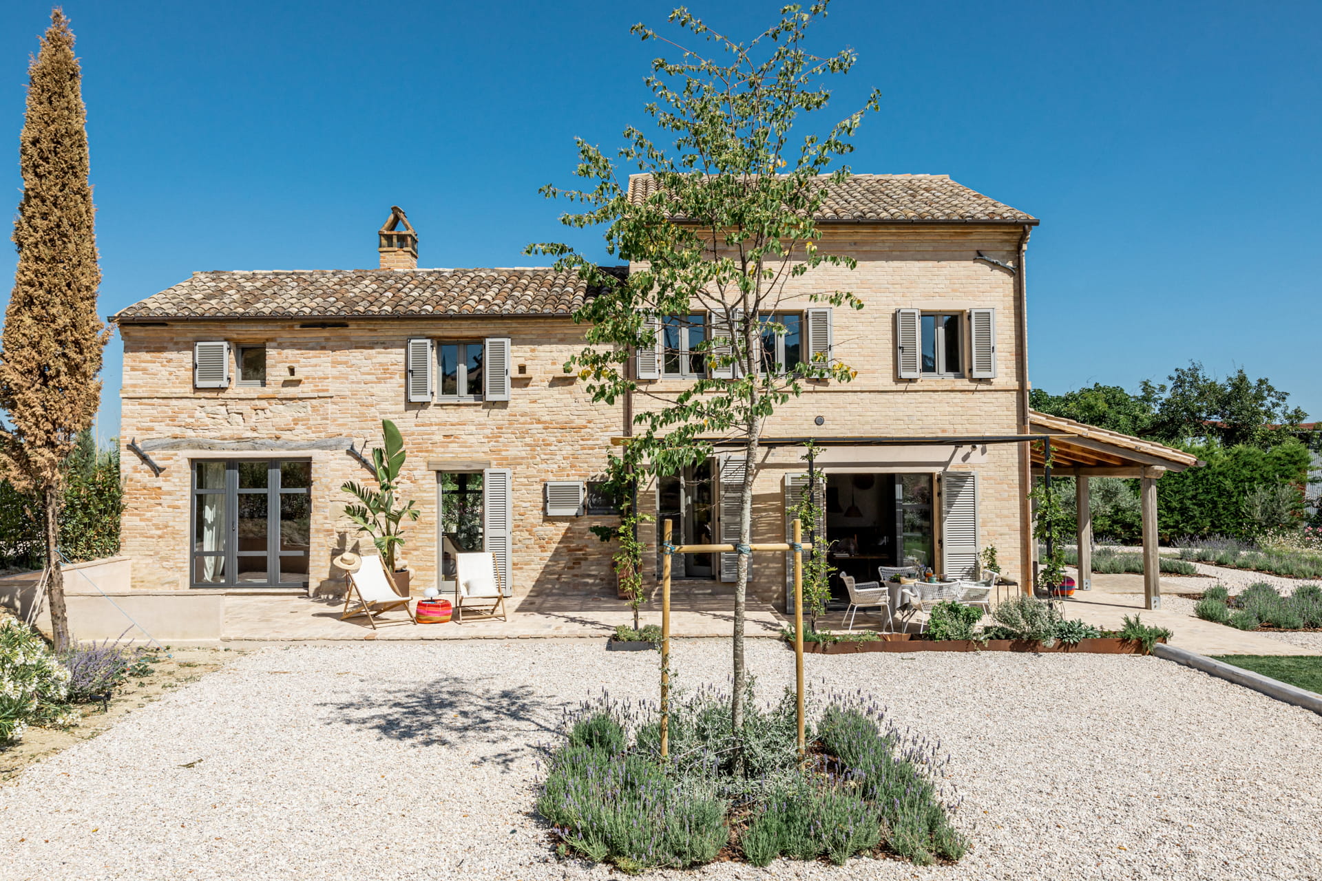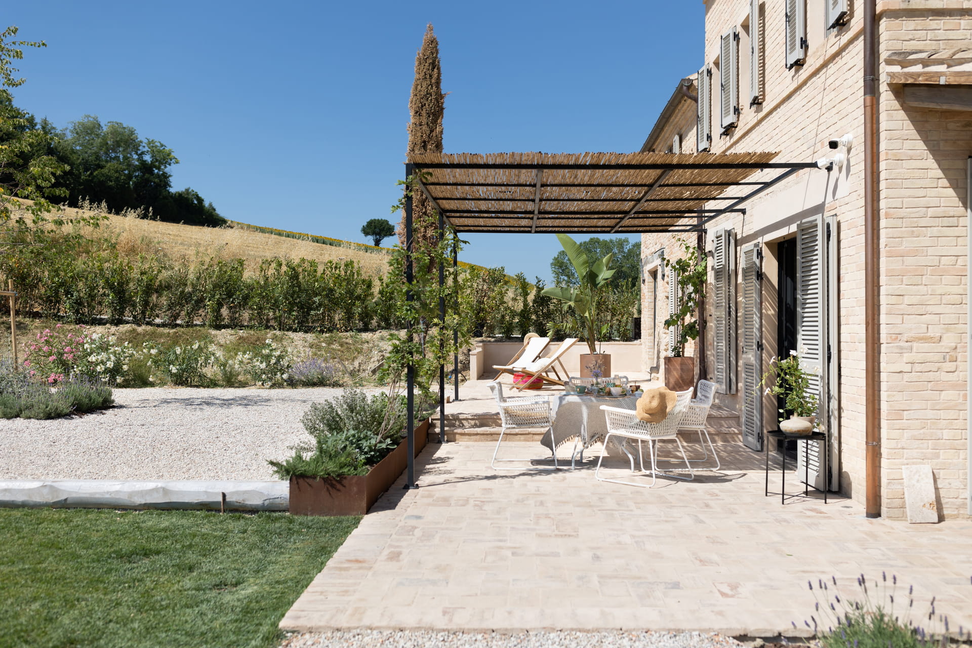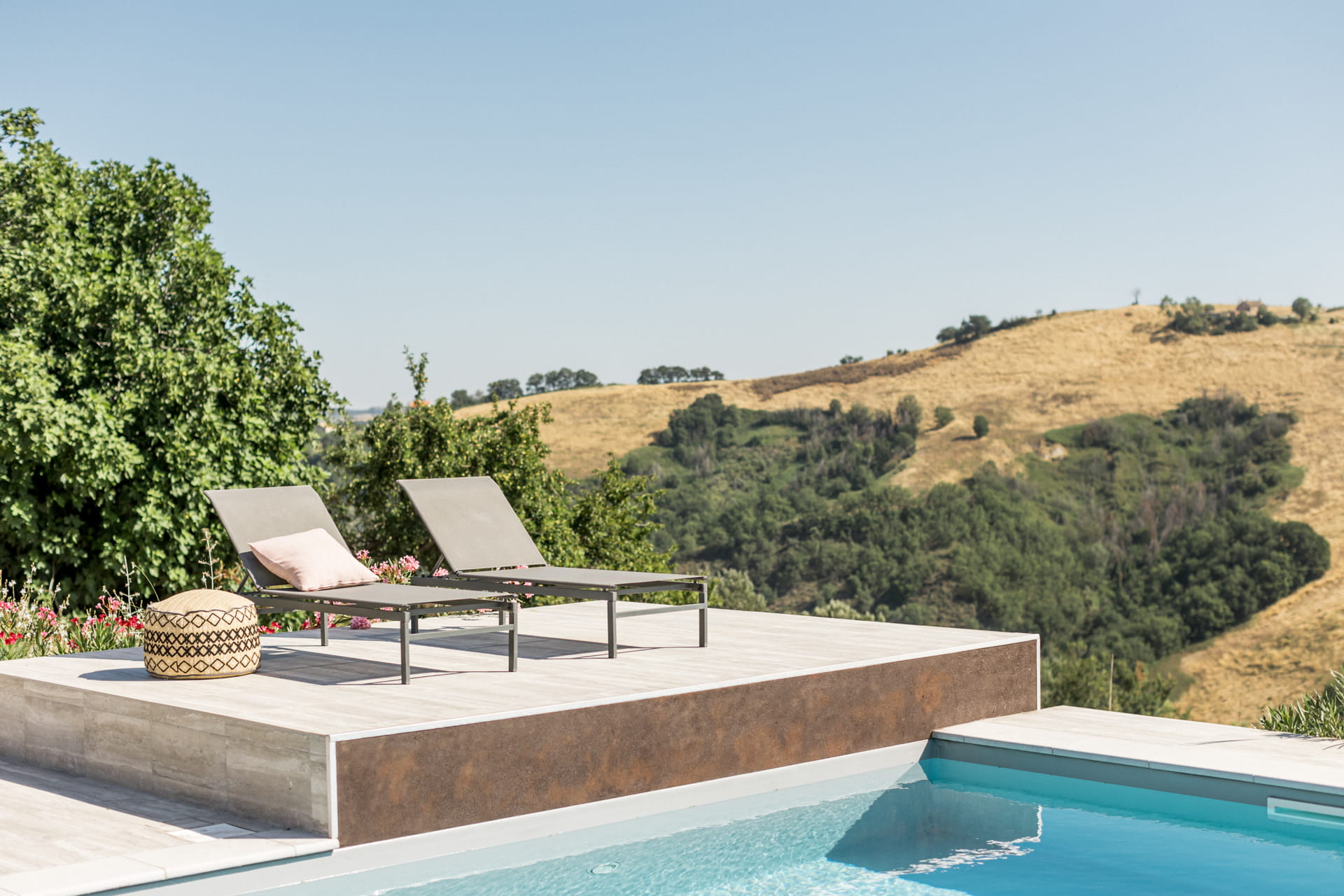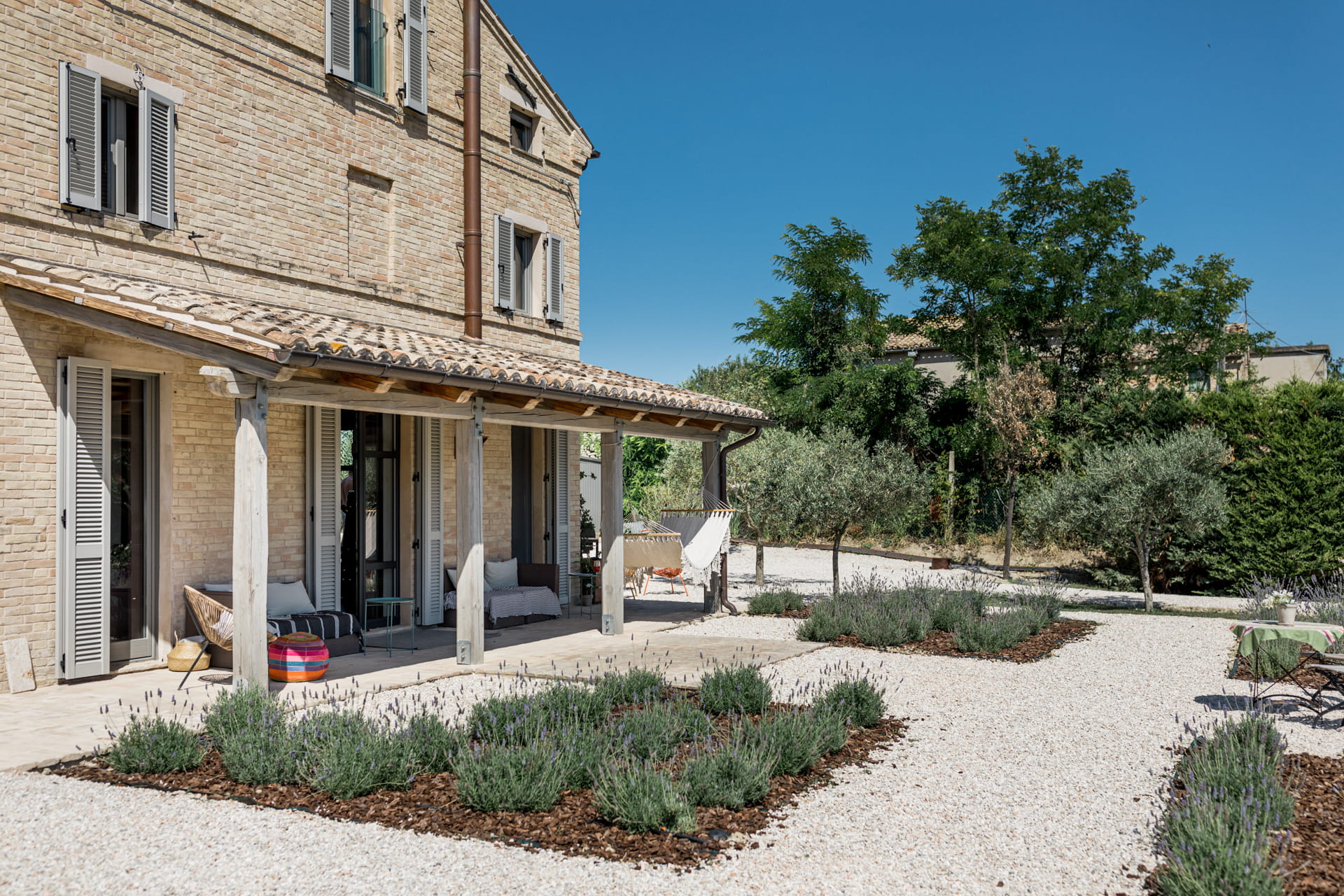 Het interieur van Casa Piane Pettirossi mag dan (meer dan) leuk en aardig zijn, het uitzicht, dat is pas echt ongeëvenaard. Vanaf de tuin kijk je over de vallei en de glooiende heuvels van Le Marche. De tuin van 2000m2 staat vol met olijfbomen en vijgenbomen. Wist je dat de eigenaren Markus en Imke hun eigen olijfolie maken? Er is een groot verwarmd privé zwembad met voldoende loungeplekken. Het terras met buitenkeuken onder de pergola zorgt ervoor dat jij zelfs op de heetste zomerdagen kunt genieten van een heerlijke luie lunch in de luwte.