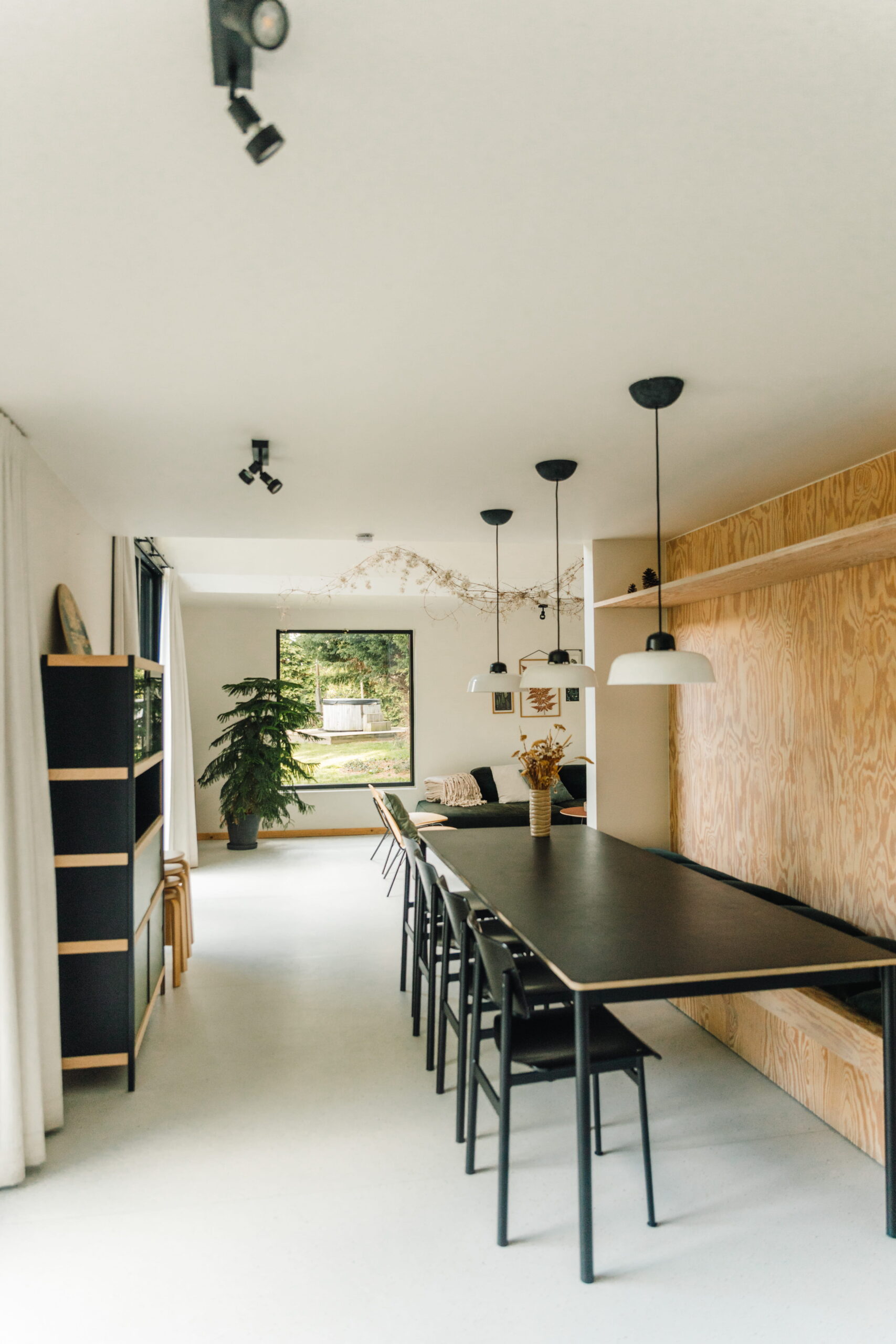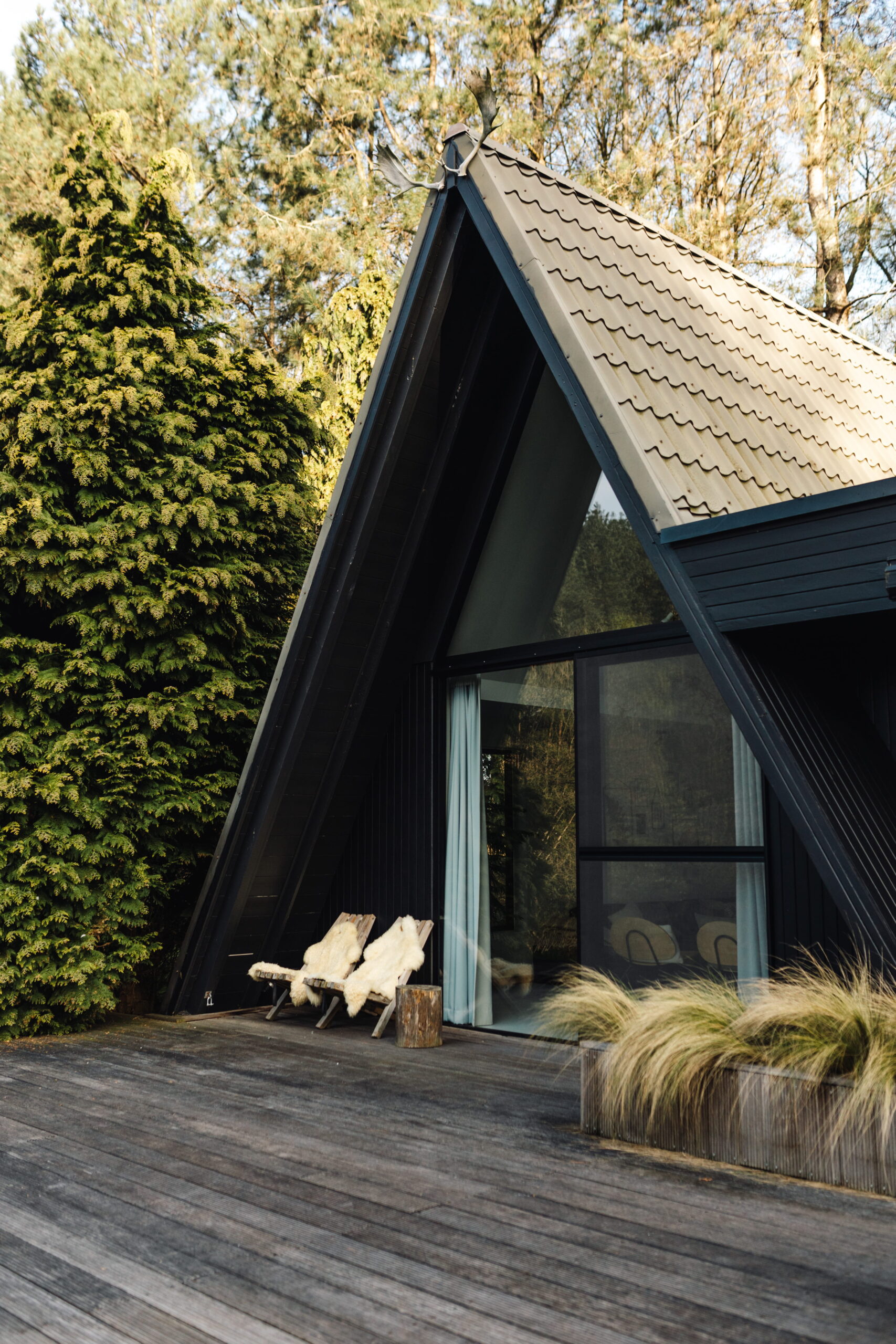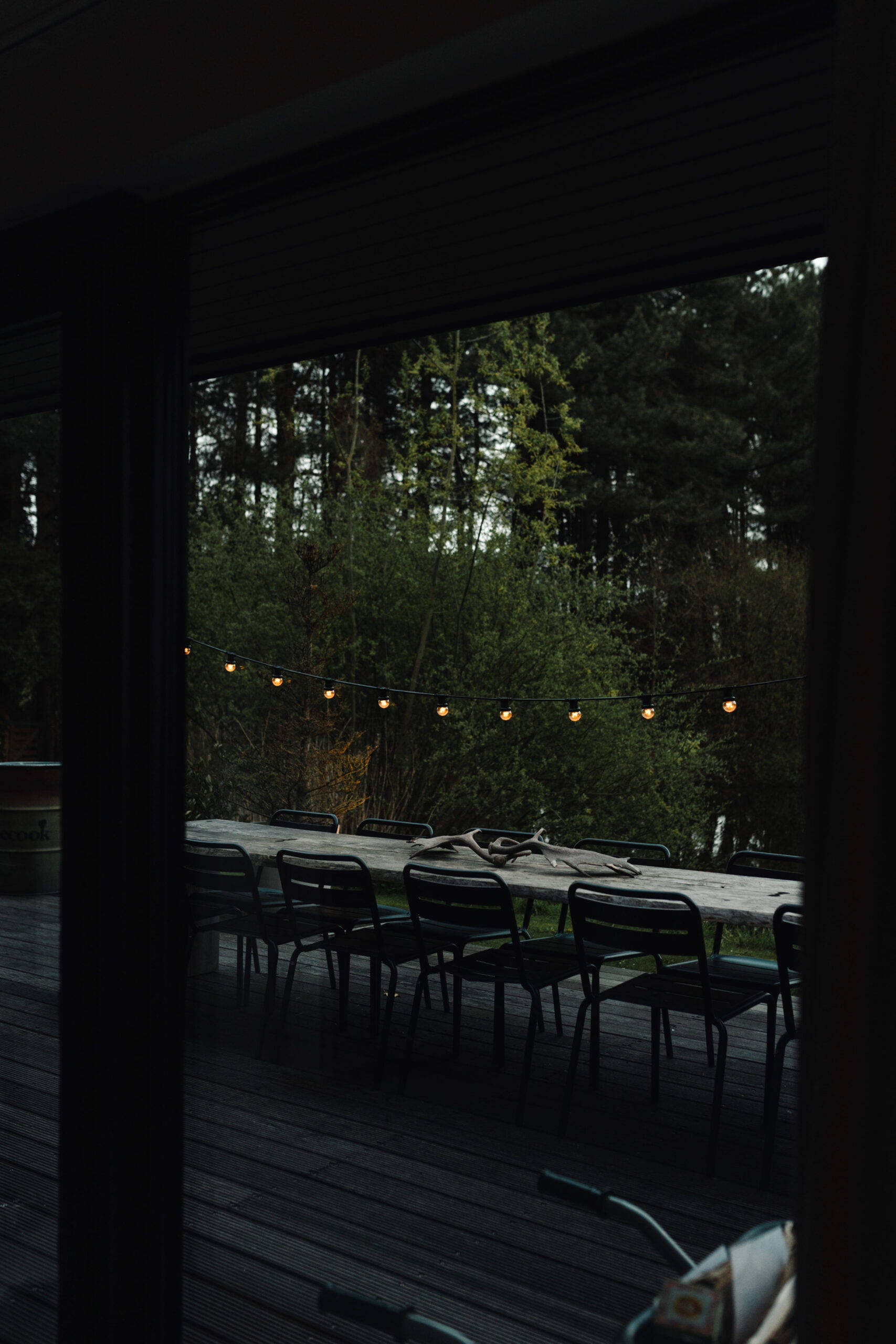 Binnen in de cabin is het knus en mooi. Veel hout, zwart en groen. Het matcht totaal met z’n omgeving. Er zijn vier slaapkamers en twee badkamers, een gezellige woonkamer die vraagt om spelletjesavonden en een keuken waar je alles vindt wat je nodig hebt voor een lekkere maaltijd. Of, je steekt de barbecue aan en geniet nog wat langer buiten. De lichtjes buiten maken het sfeervol en knus.