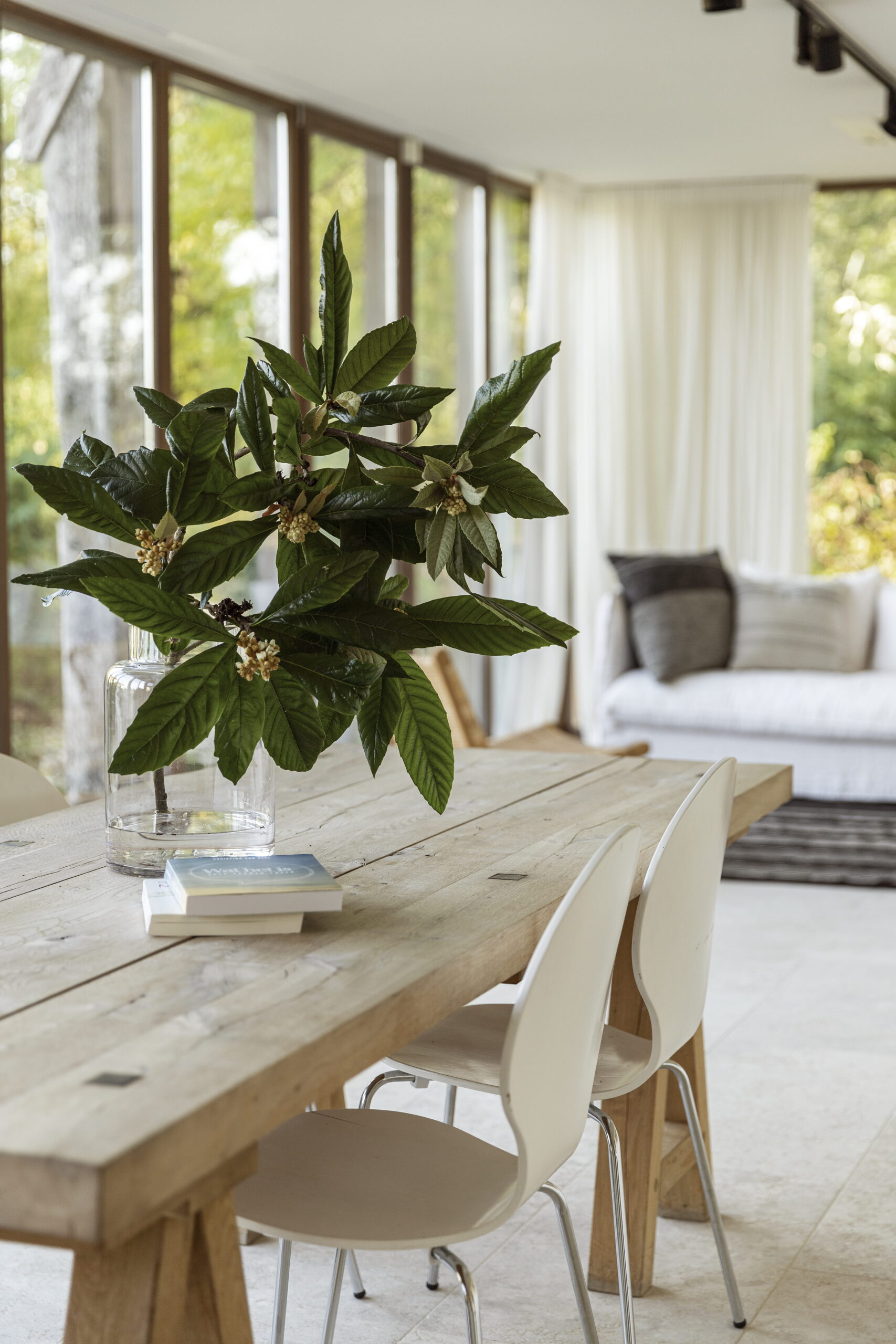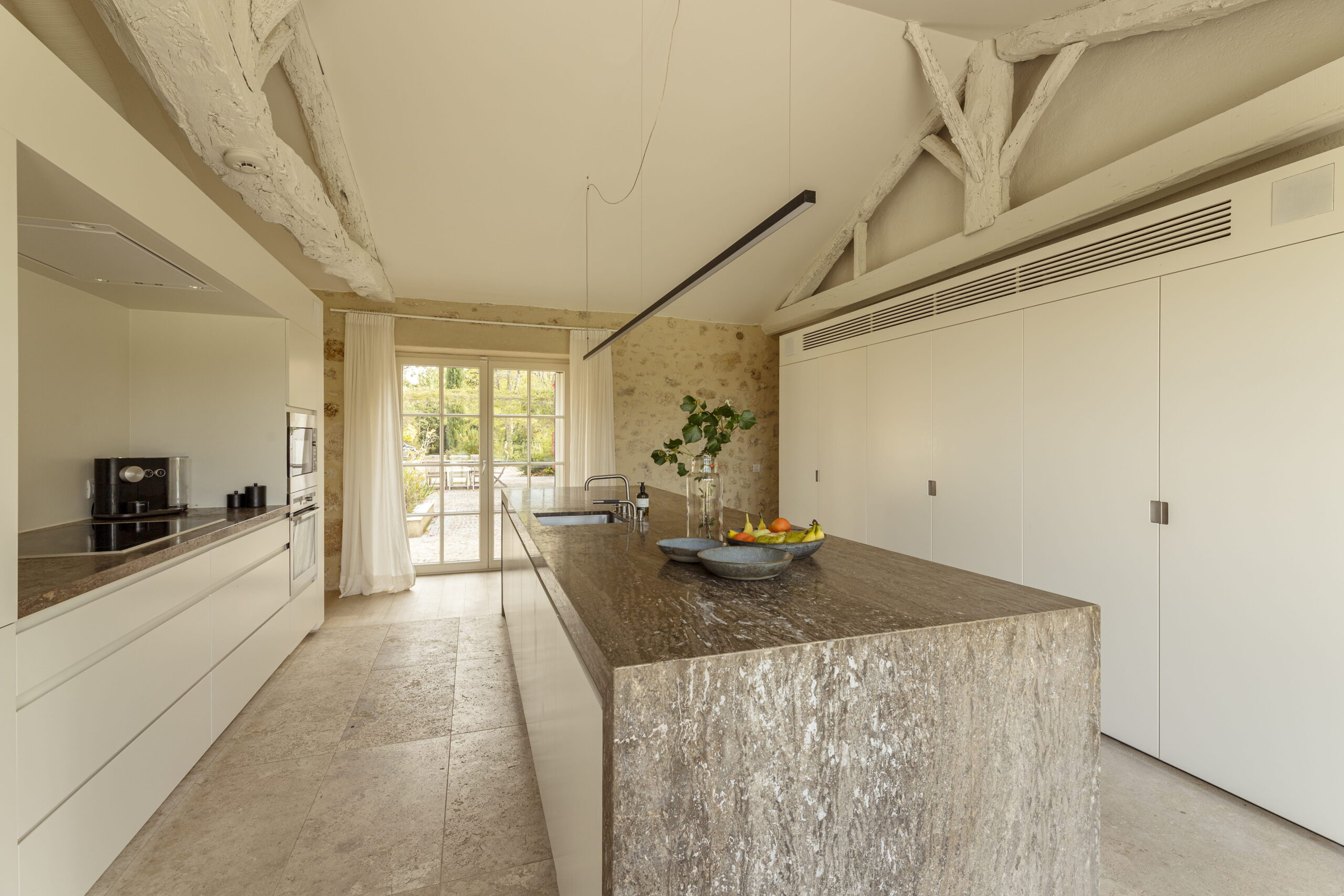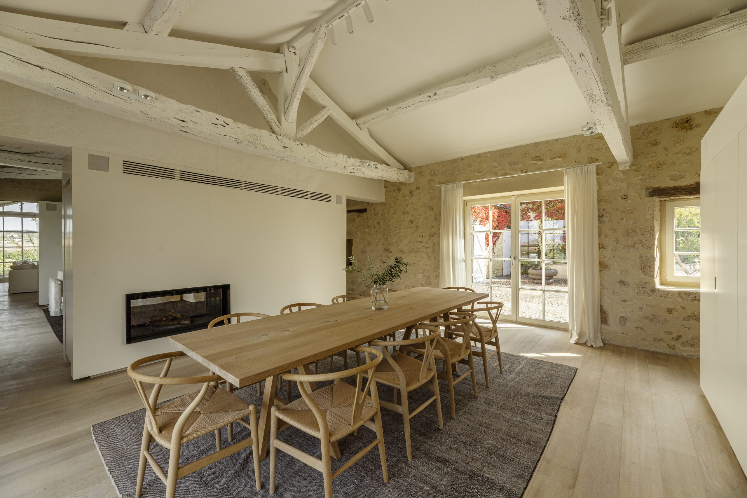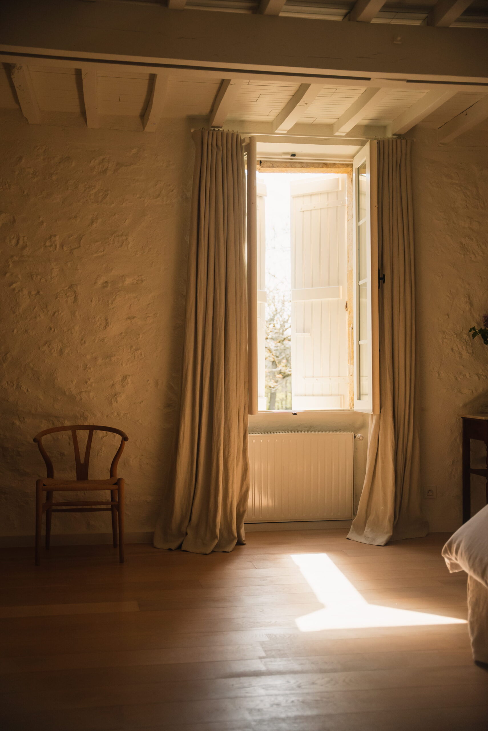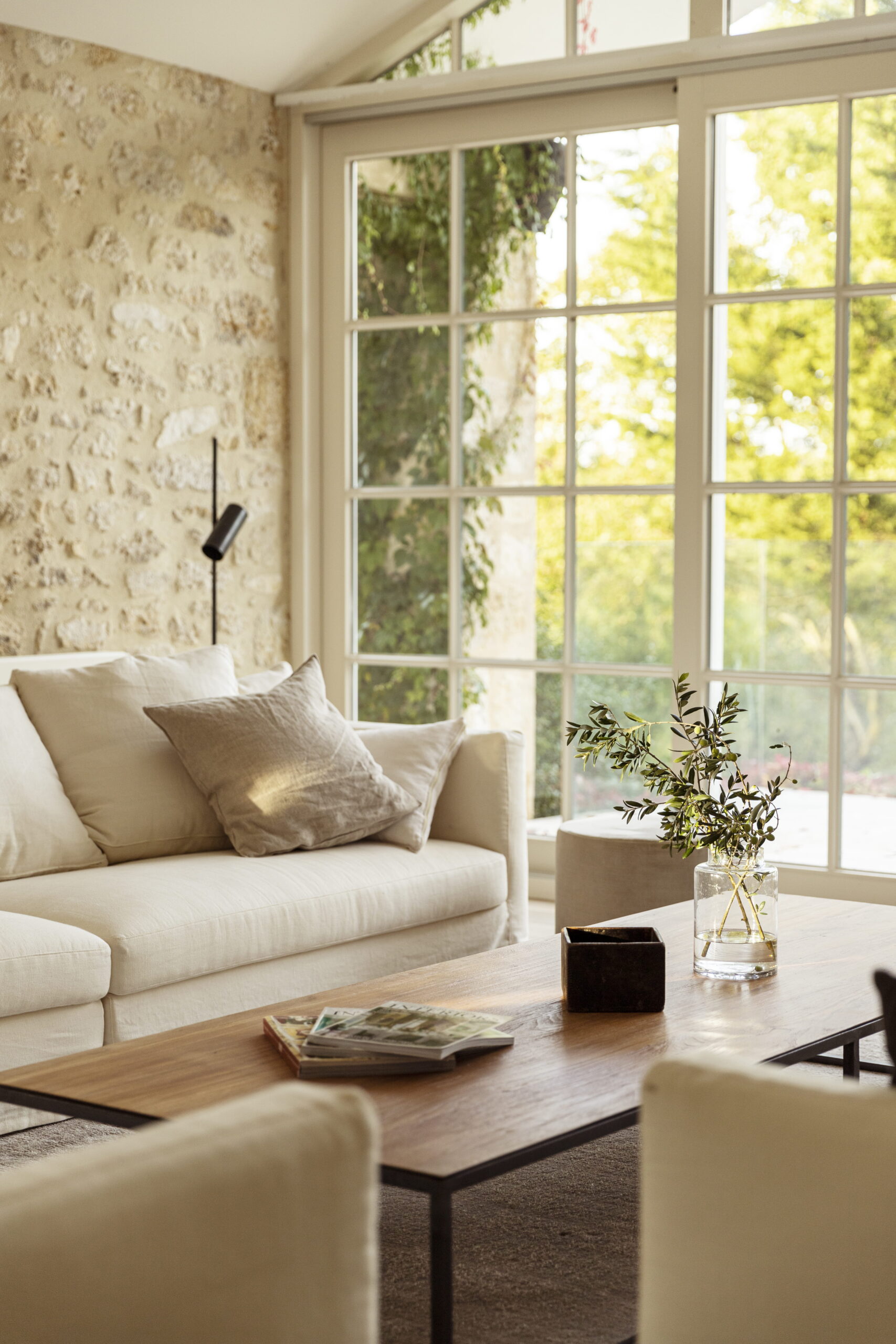 Het huis heeft de perfecte mix van verfijnde rustieke charme en modern design. Denk: dikke stenen muren, houten balken en grote ramen waar het zonlicht zo prachtig doorheen valt. Binnen klopt álles. Warme aardetinten, zachte stoffen, vintage vondsten en stijlvolle designstukken – allemaal met zorg uitgekozen. Je loopt hier naar binnen en denkt meteen: Wow, hier wil ik blijven.