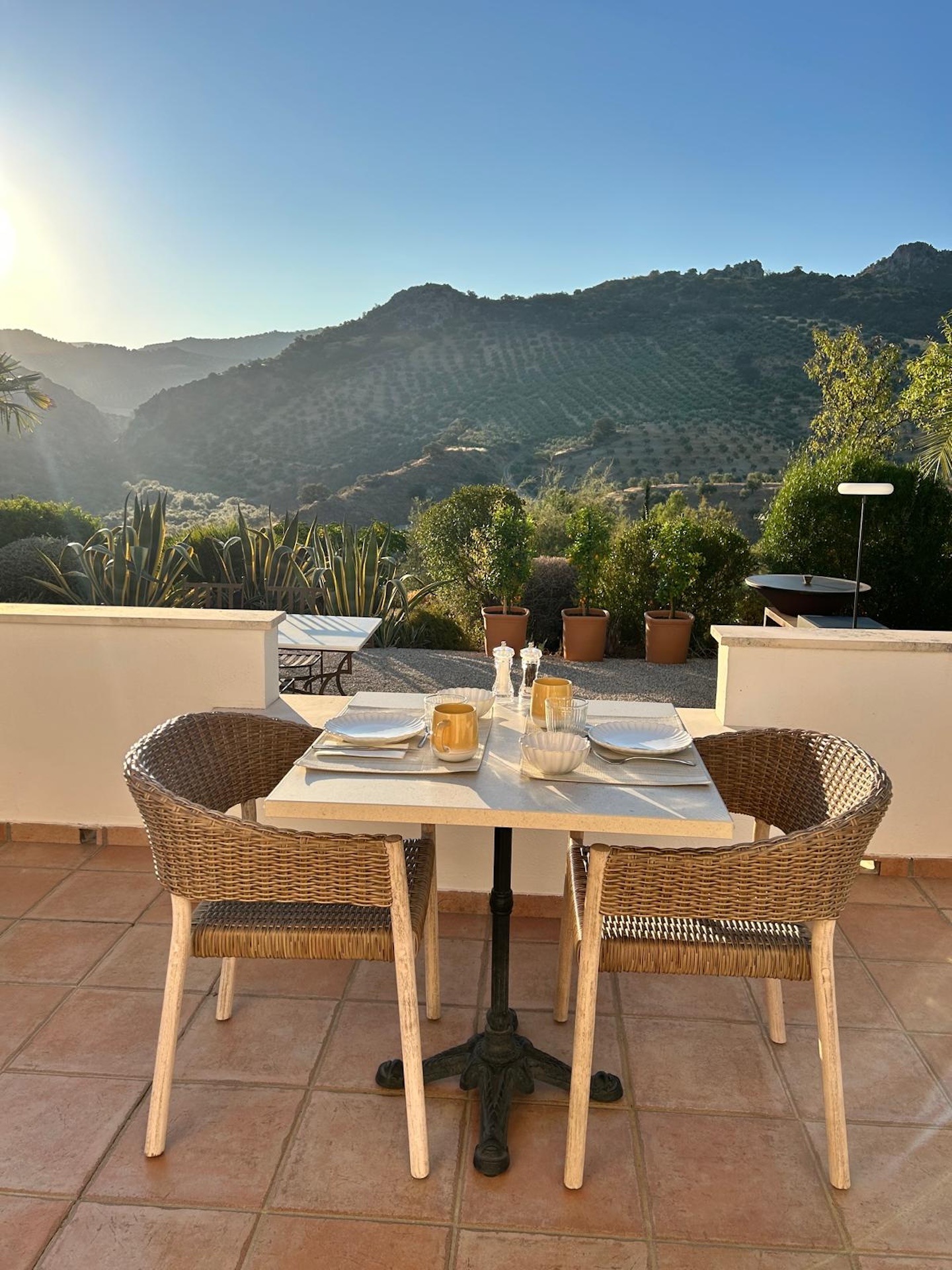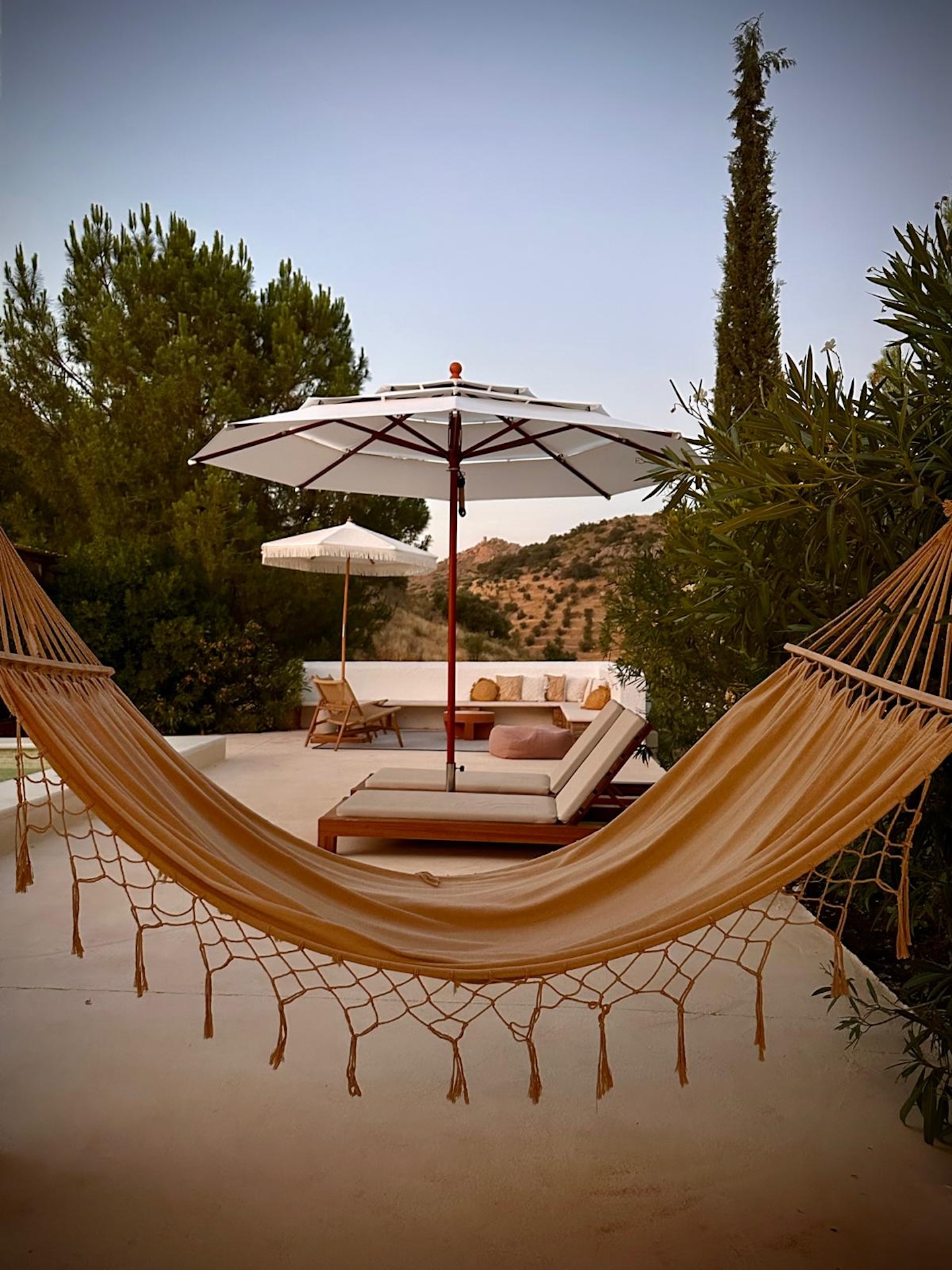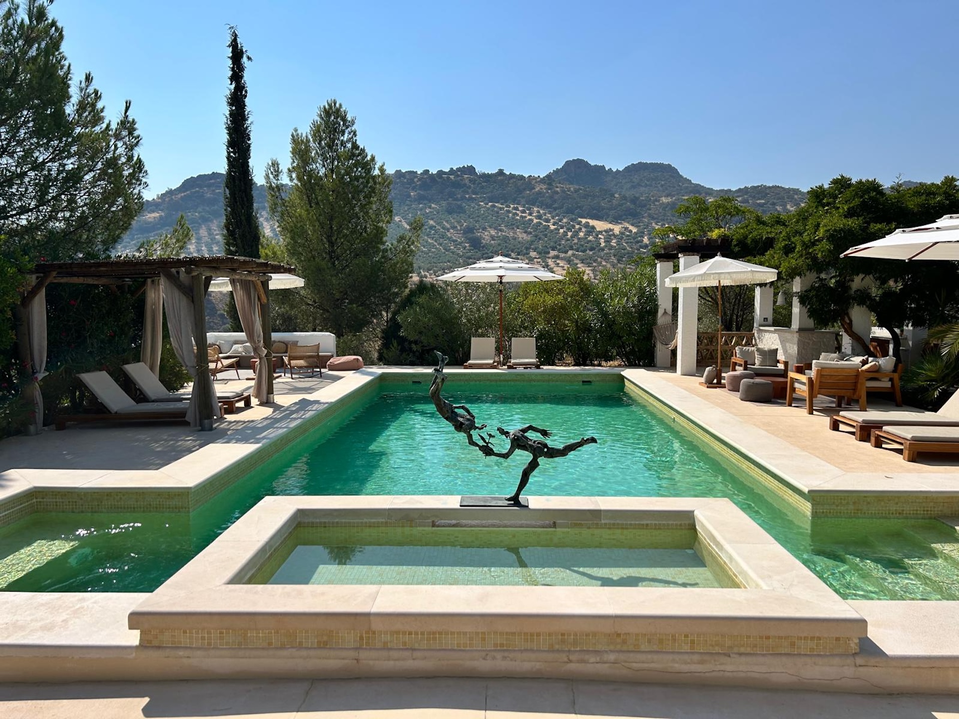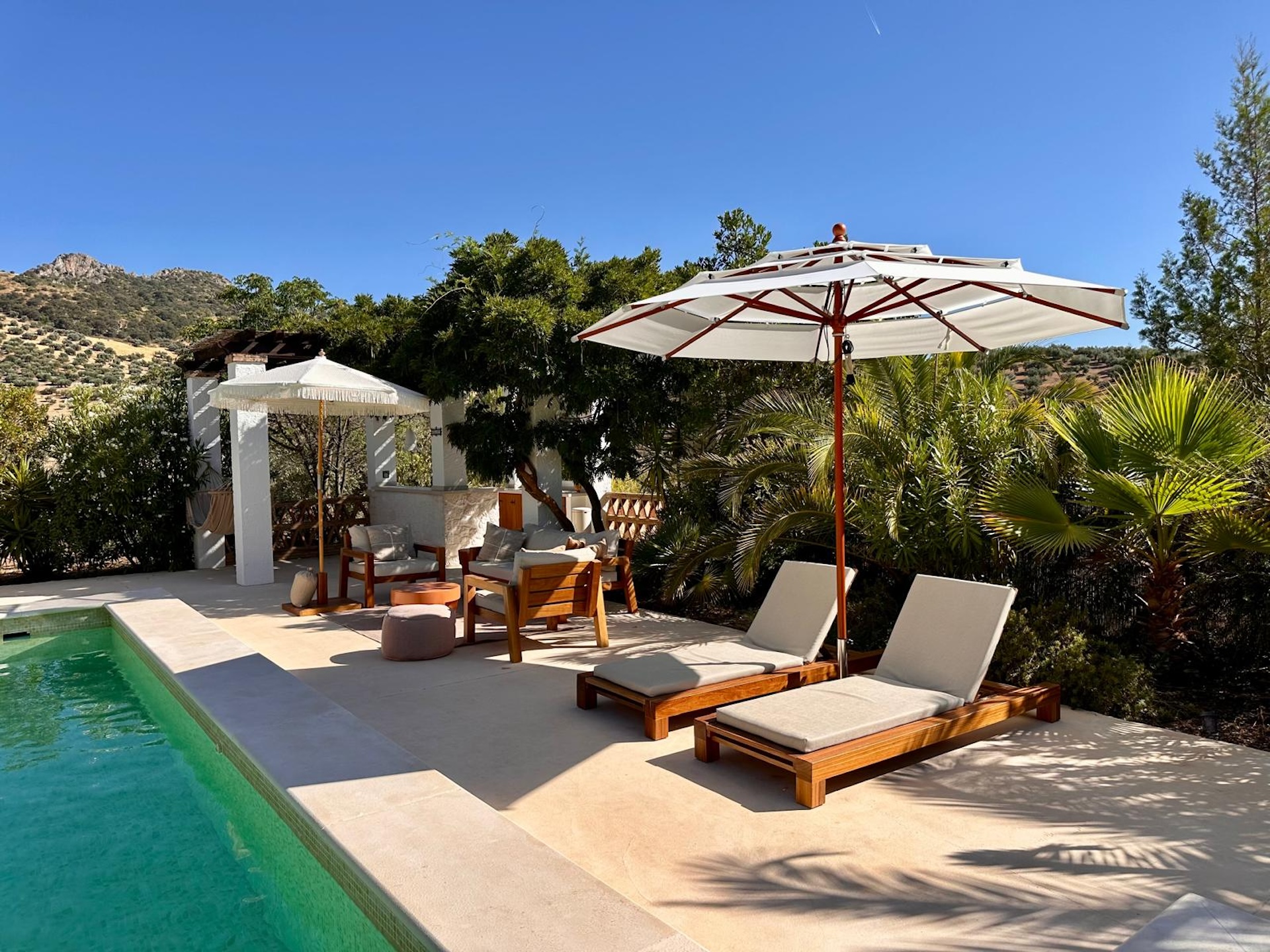 Buiten ontvouwt zich het echte wauw-gevoel. Een groot privéterrein vol olijfbomen, terrassen en een zwembad met 360° uitzicht over de bergen van de Sierra Leones. Zonnebedden, schaduwplekken, een poolbar voor iets fris tussendoor. Hier dobberen de uren vanzelf voorbij. En alsof dat nog niet genoeg is: Sylvie en Xavier koken één keer per week voor de gasten en een heerlijk ontbijtbuffet kan je voor de ochtend bijboeken. Ohh, en als je wilt, ga je mee op een avontuurlijke 4×4-jeep tour door het ruige landschap rondom de hacienda.