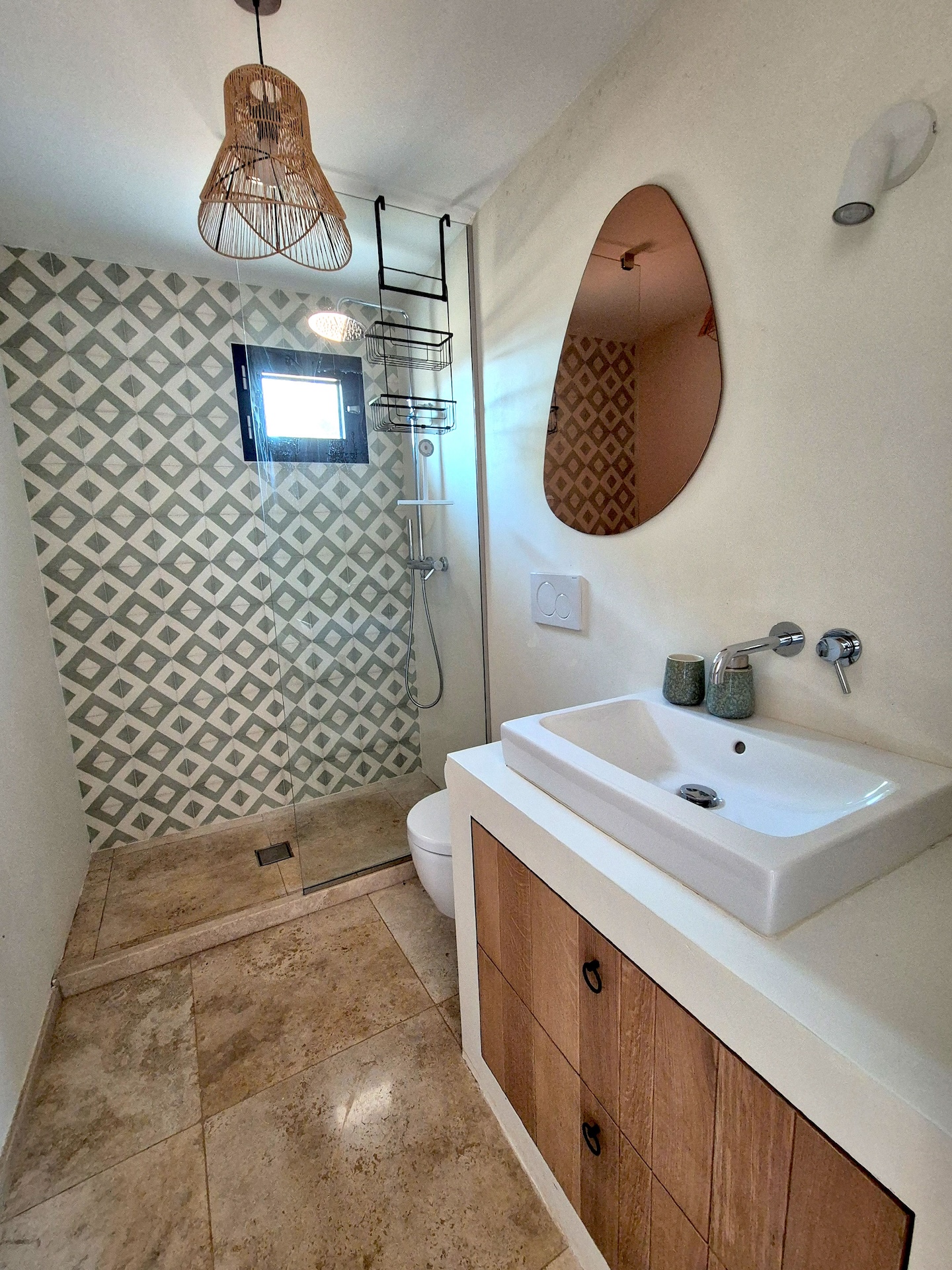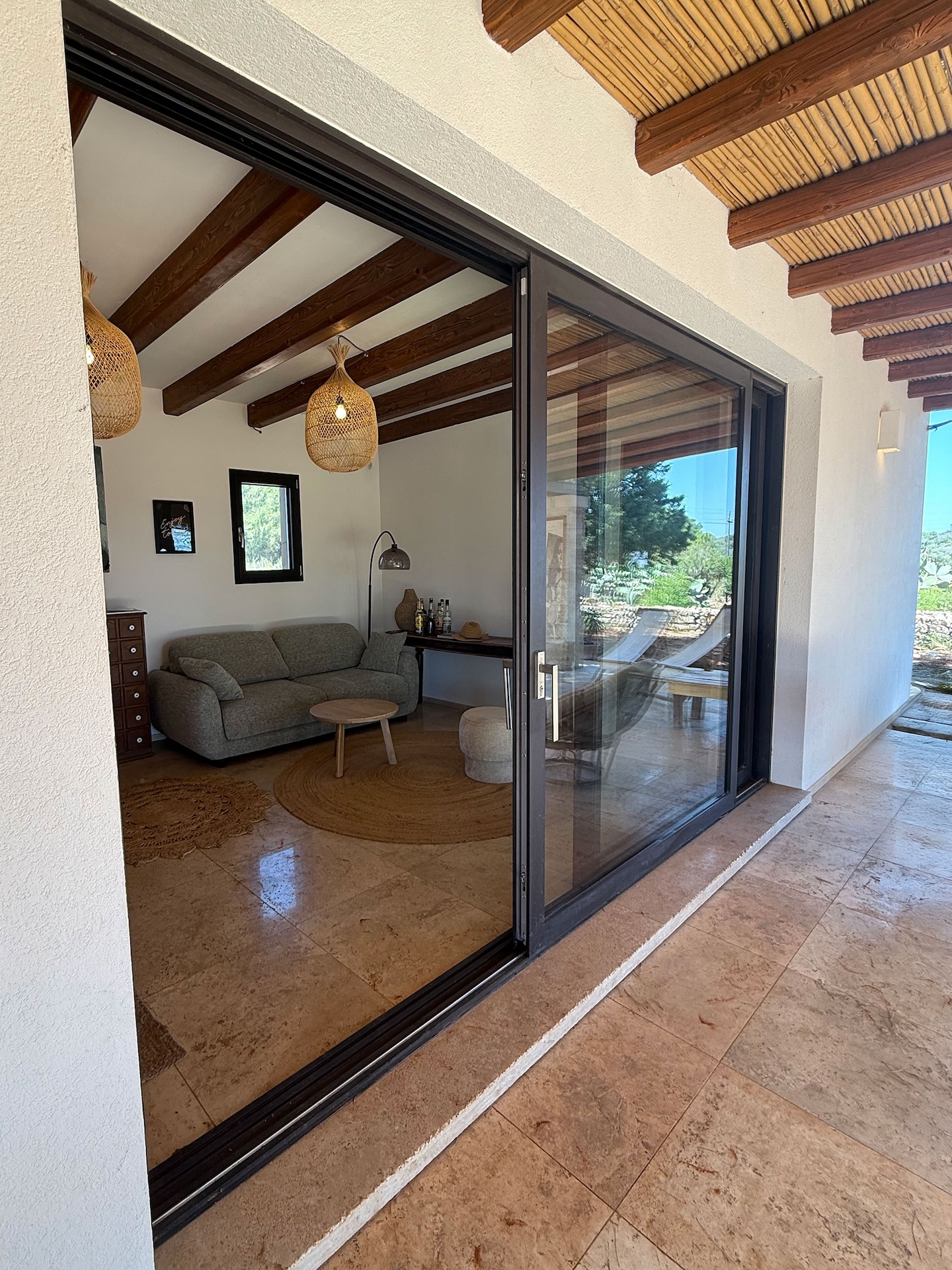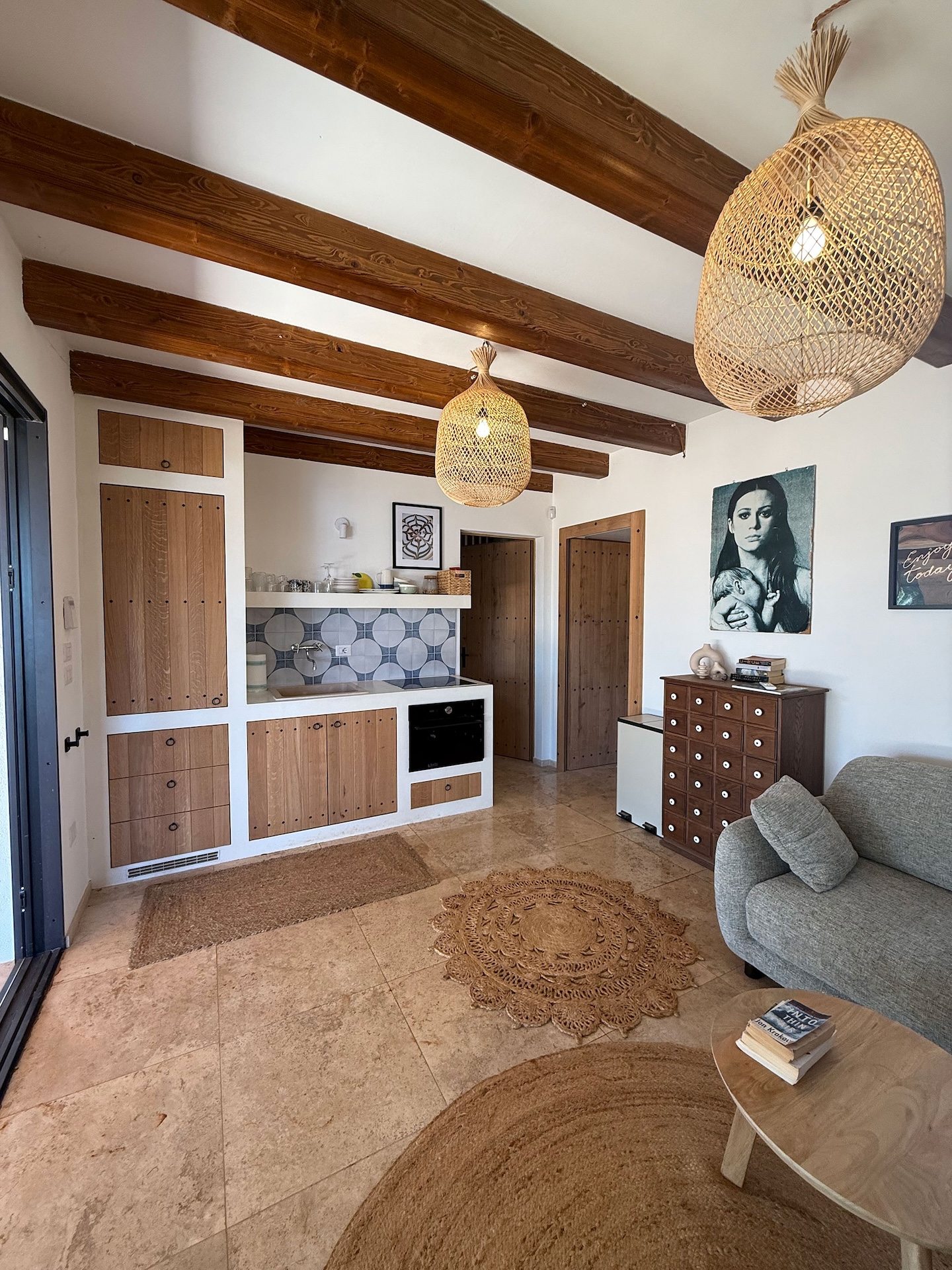 Hier leef je vanzelf buiten. Deuren open, grote terrassen, schaduwplekken, buitendouches, 360º-uitzicht – overal hoekjes waar je even met een boek verdwijnt. De mediterrane tuinen zijn uitgestrekt: olijfbomen, granaatappels, citrus, vijgen en druiven die je zo mag plukken. In het hart ligt een infinity pool met houten vlonders, natuurlijke parasols en een jacuzzi vanwaar je ’s avonds naar de sterren kijkt.