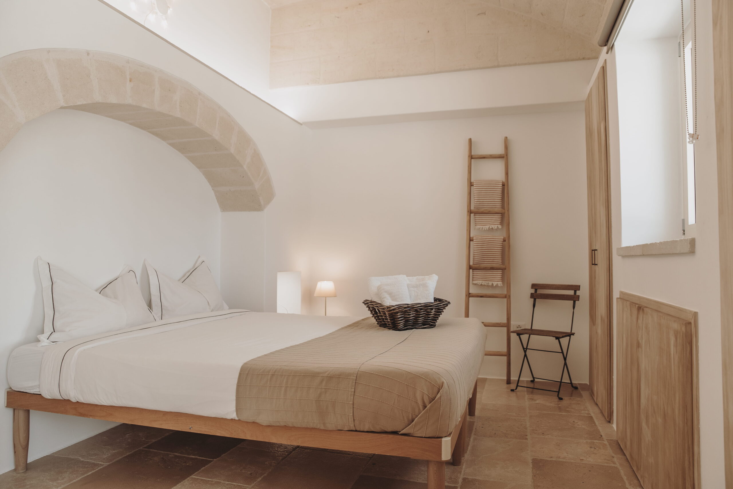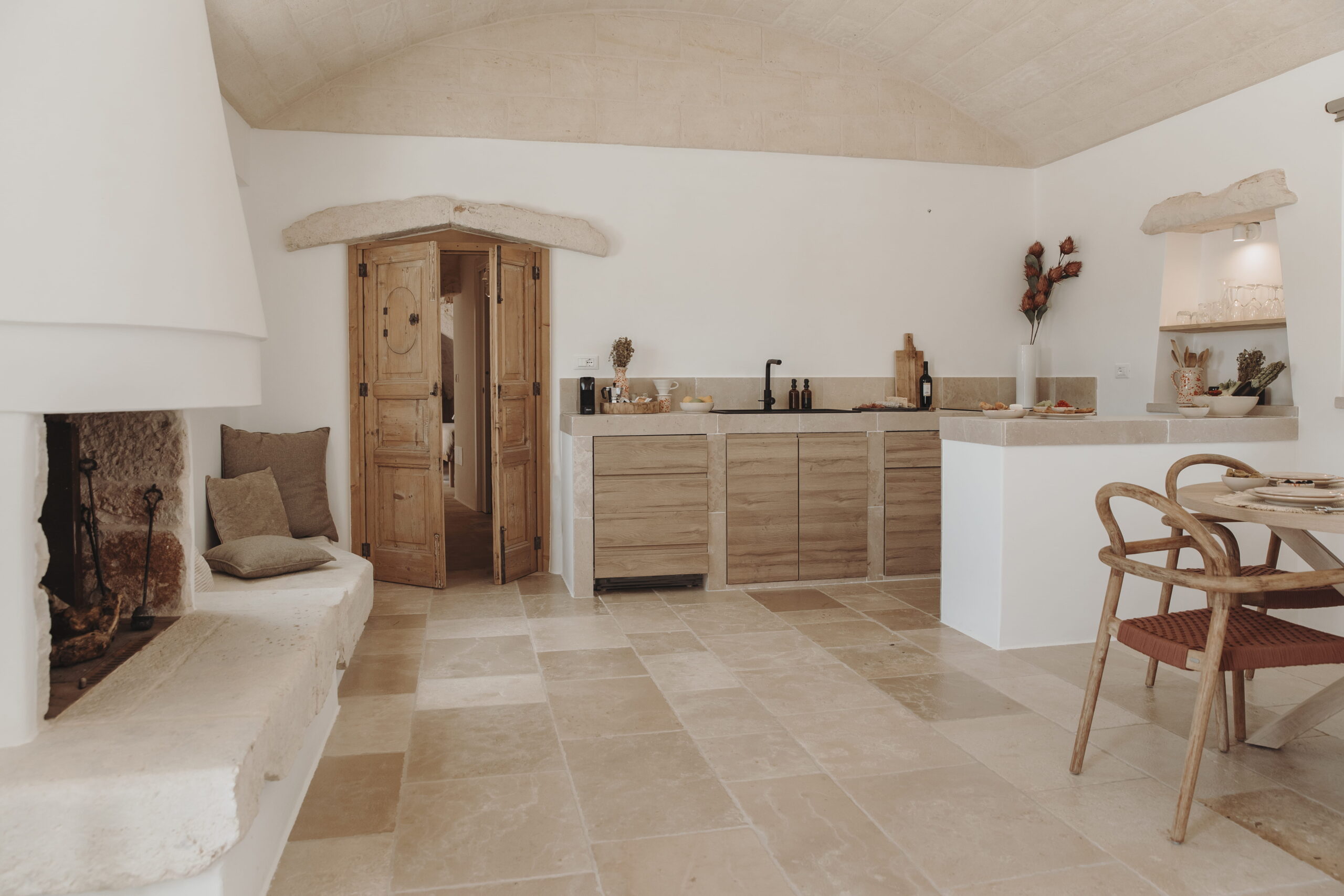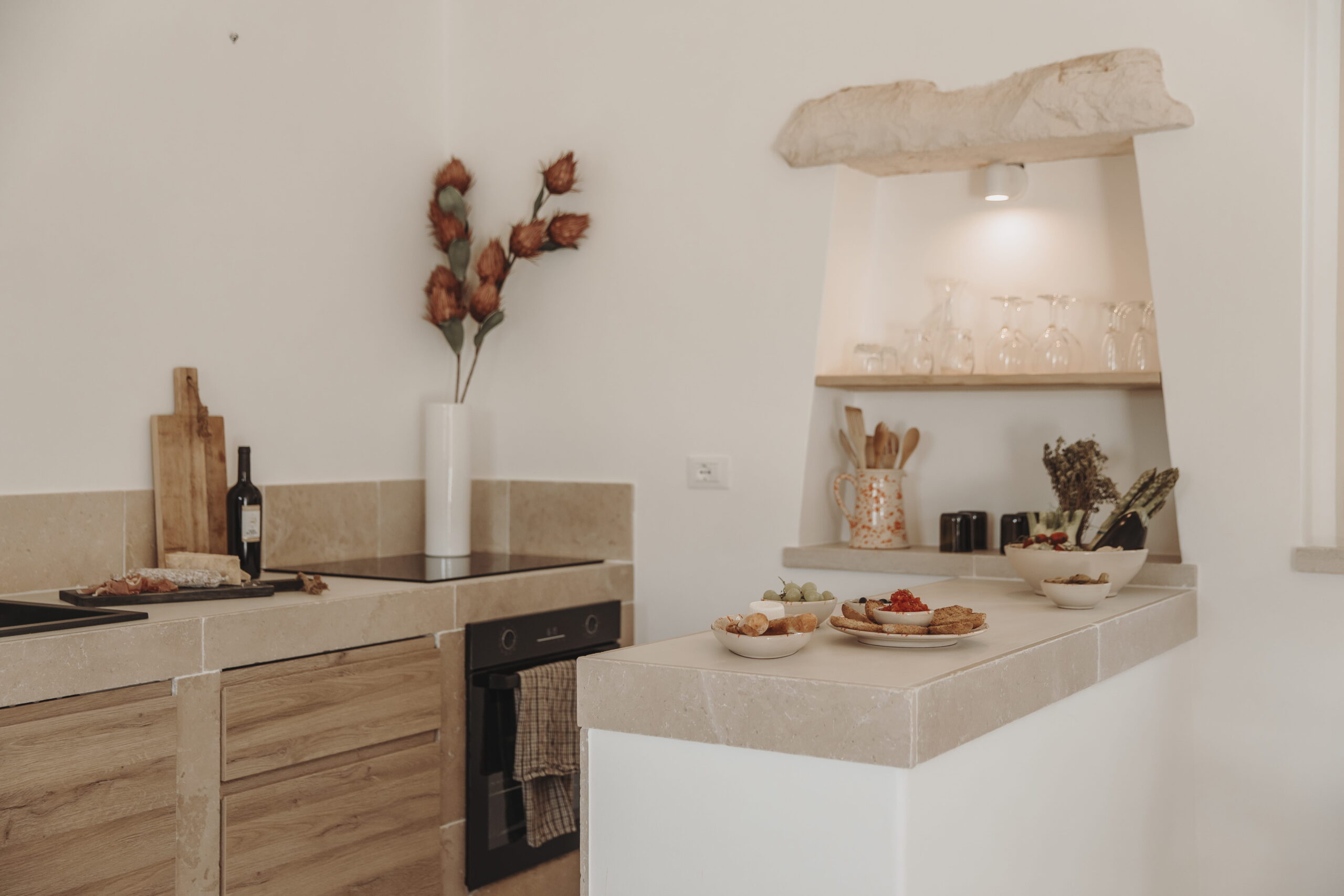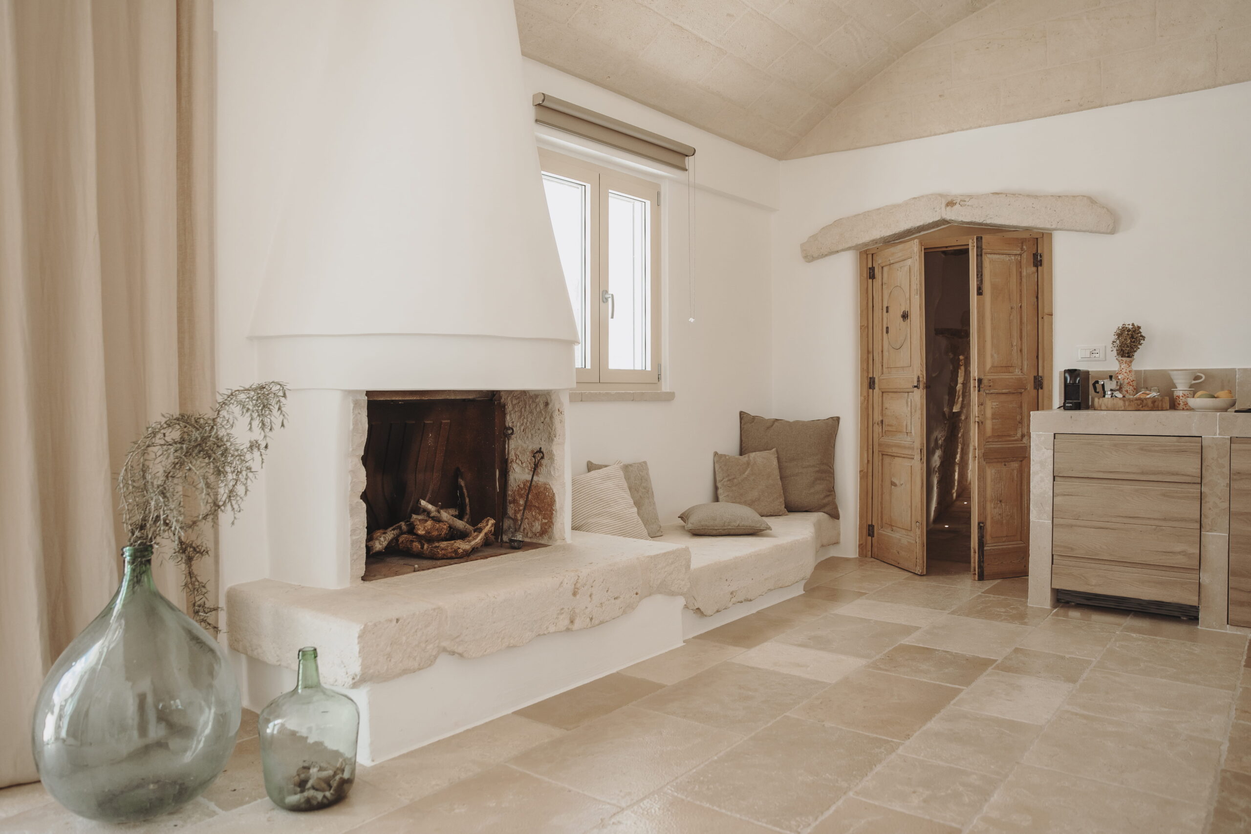 Binnen wacht een stijlvolle mix van authentieke en eigentijds inrichting. In de charmante, eeuwenoude trullo slaap je onder een gewelfd stenen dak met ensuite badkamer én een luxe vrijstaand bad. De aangebouwde lamia voelt aan als een knusse cocon: een sfeervolle woonkamer, een open keuken en een tweede slaap- en badkamer. Alles ademt mediterrane rust, met zachte aardetinten, natuurlijke materialen als hout, steen, linnen en een serene sfeer. Extraatjes? Airco voor de zomerdagen, een haard voor knusse avonden en een keuken die smeekt om lokale ingrediënten.
