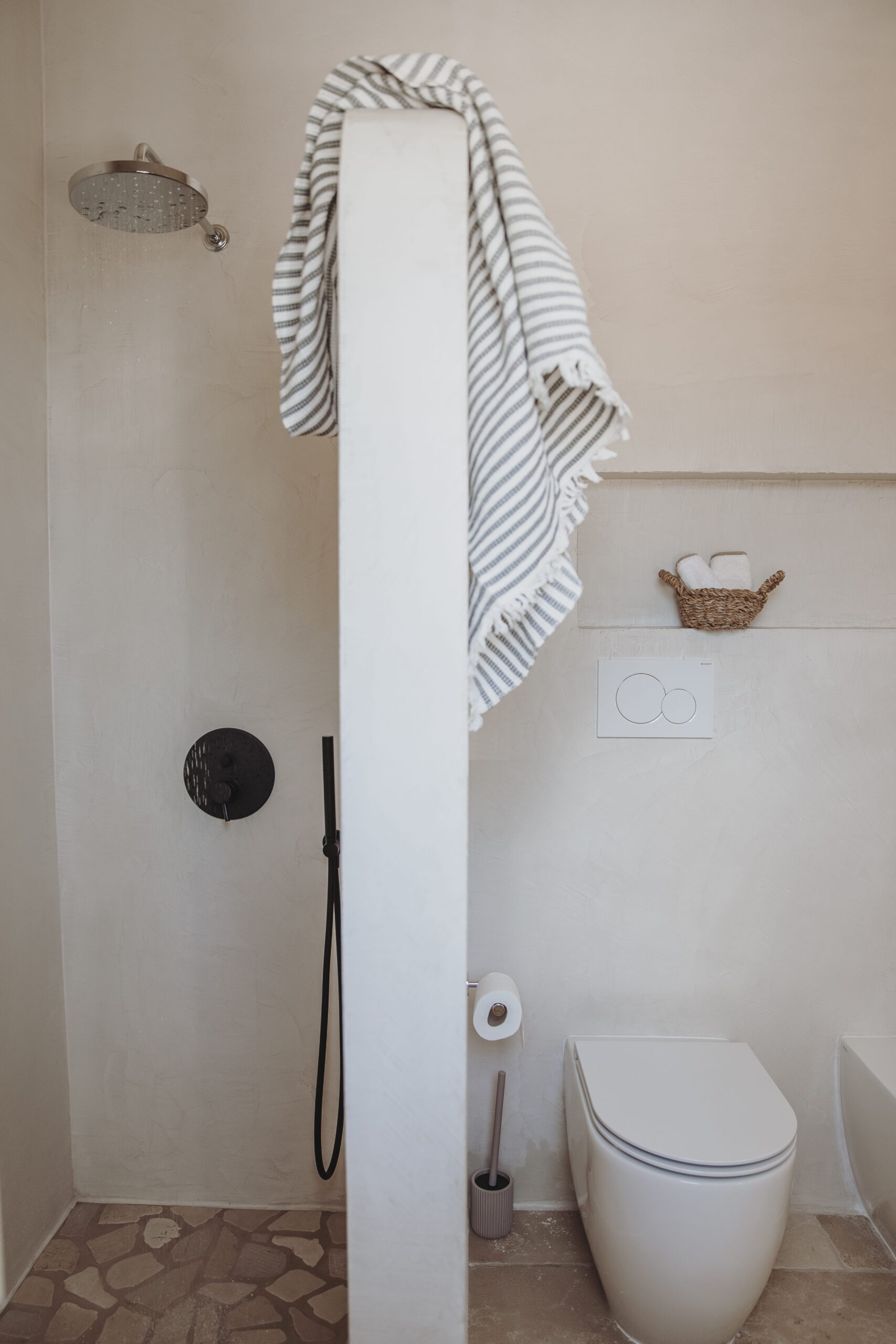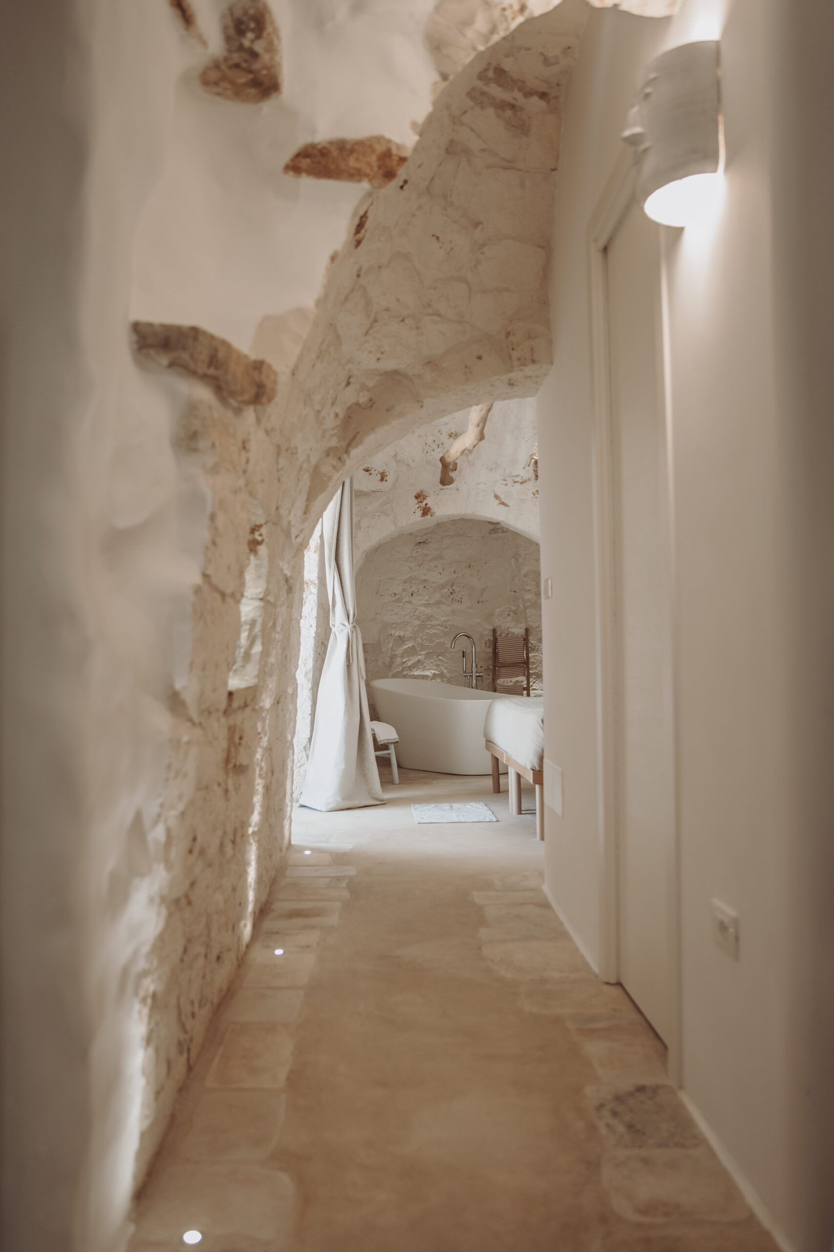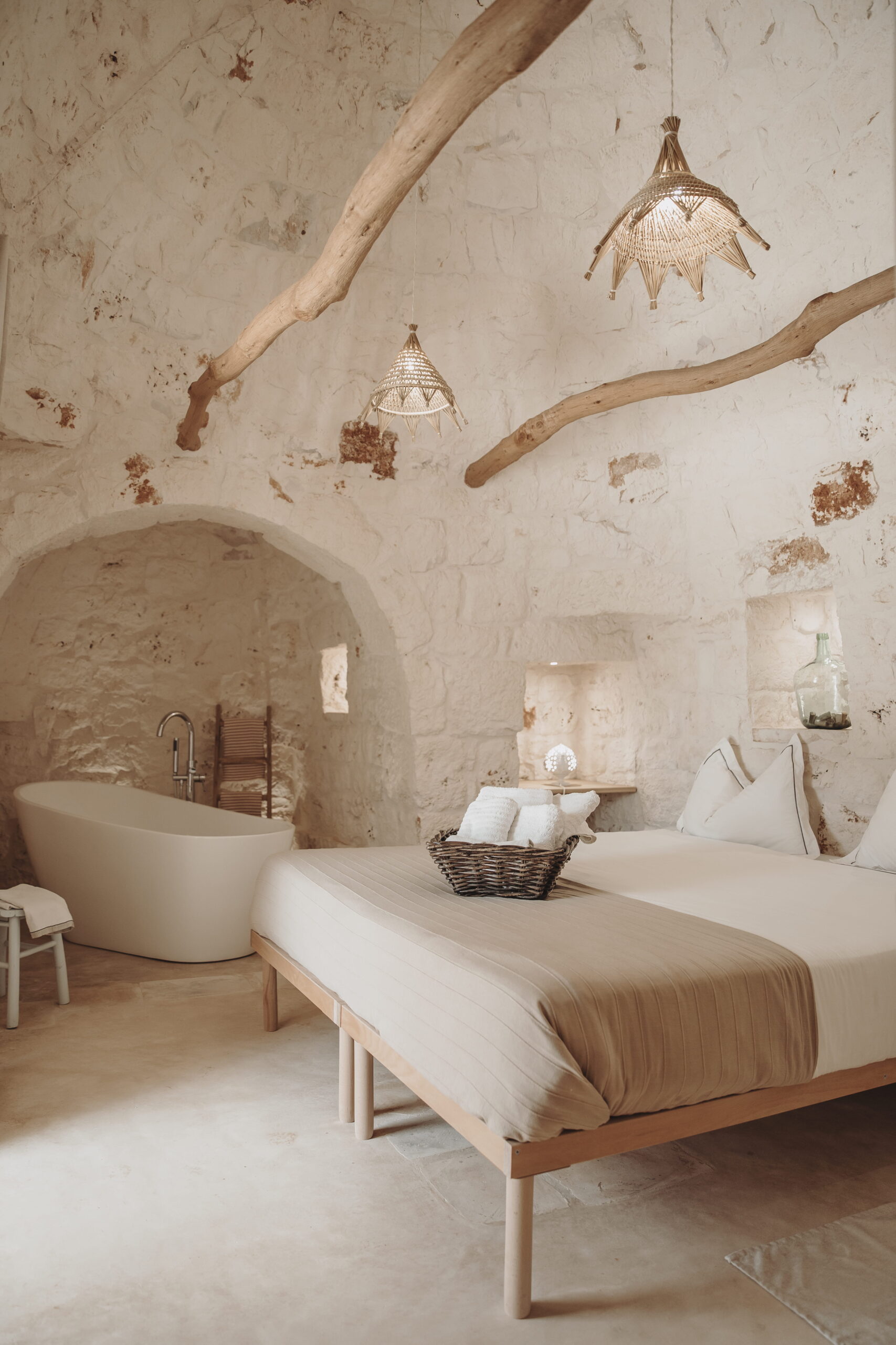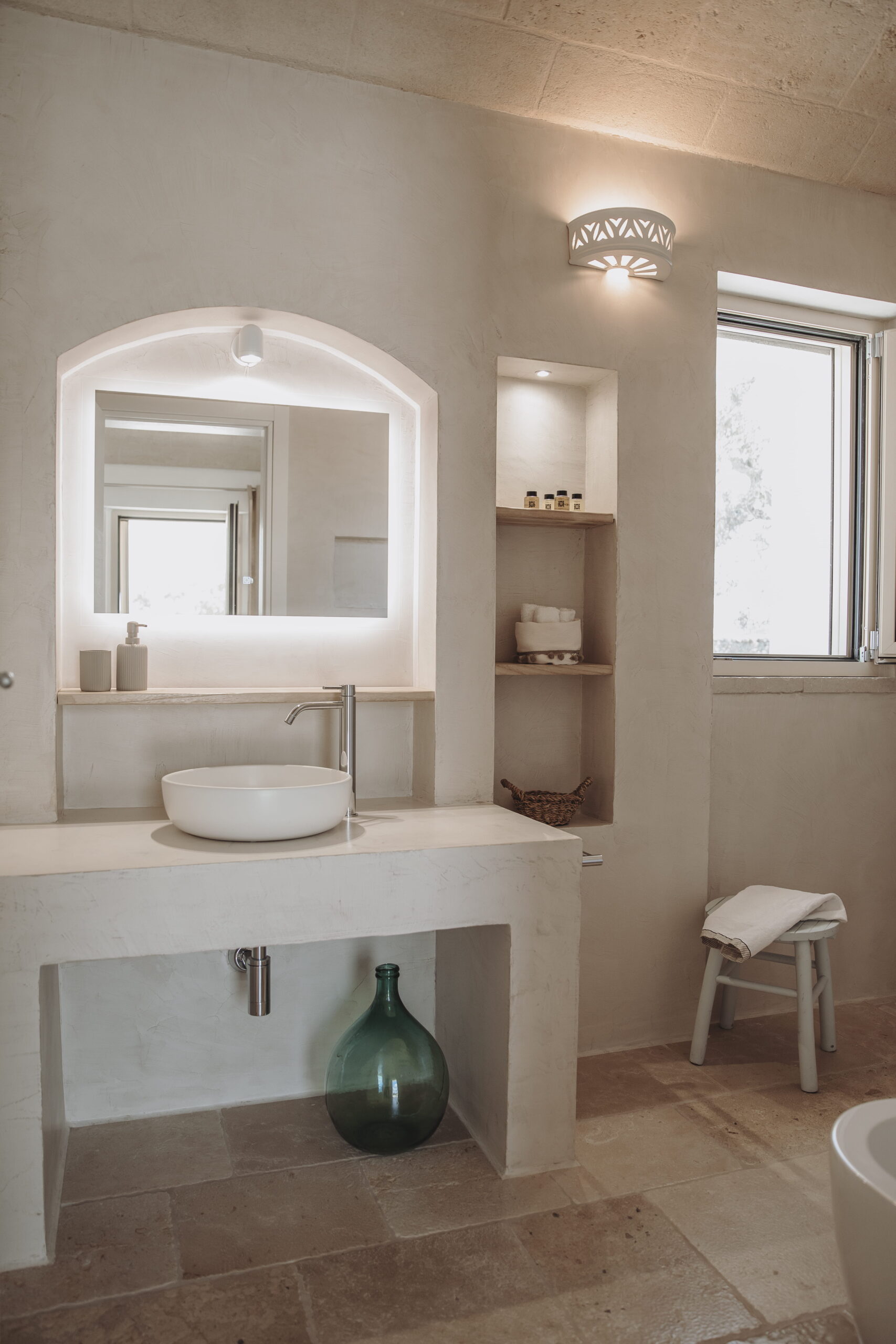 Binnen wacht een stijlvolle mix van authentieke en eigentijds inrichting. In de charmante, eeuwenoude trullo slaap je onder een gewelfd stenen dak met ensuite badkamer én een luxe vrijstaand bad. De aangebouwde lamia voelt aan als een knusse cocon: een sfeervolle woonkamer, een open keuken en een tweede slaap- en badkamer. Alles ademt mediterrane rust, met zachte aardetinten, natuurlijke materialen als hout, steen, linnen en een serene sfeer. Extraatjes? Airco voor de zomerdagen, een haard voor knusse avonden en een keuken die smeekt om lokale ingrediënten.