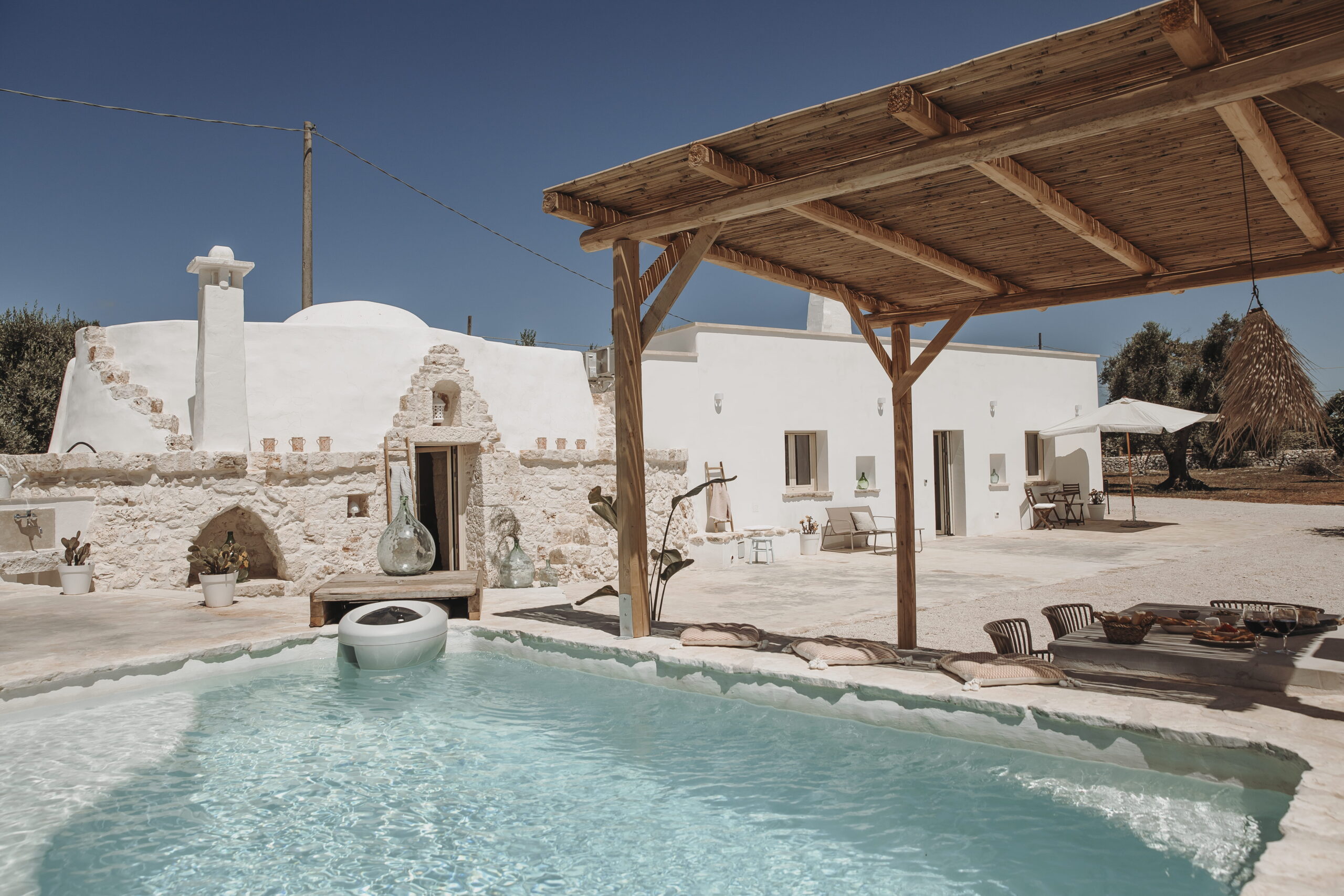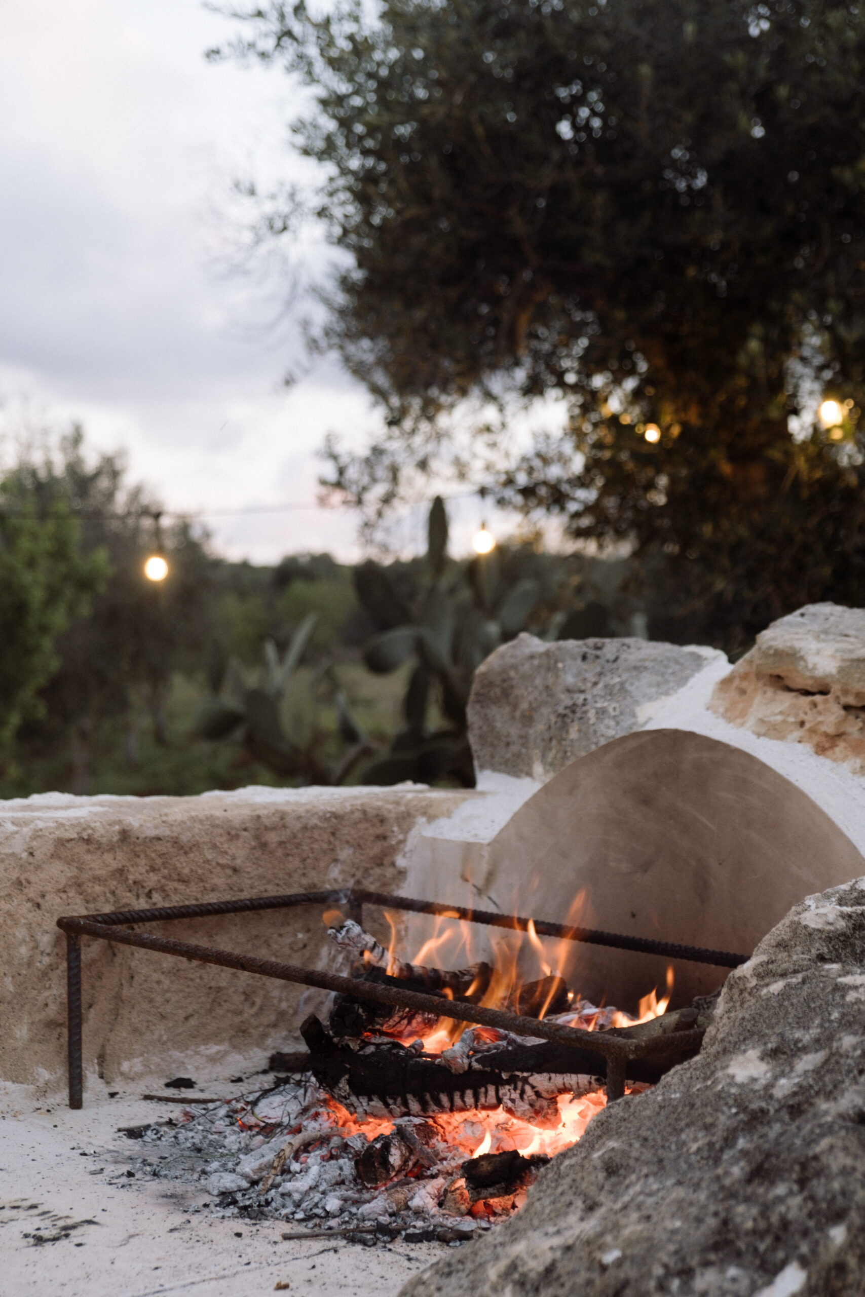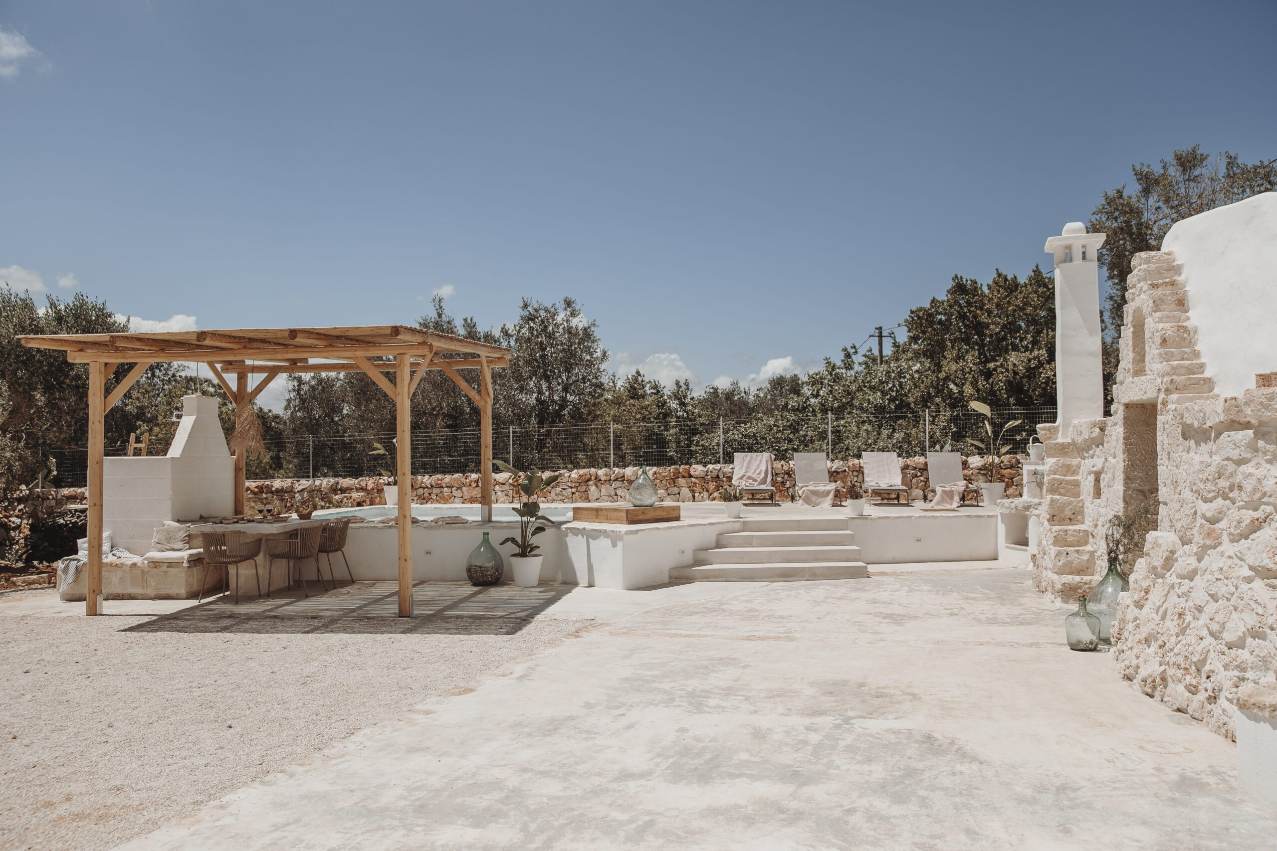 Buiten leef je het dolce vita zoals het bedoeld is. Pluk wat granaatappels van je eigen boom, dompel je onder in het zwembad (met apart ondiep gedeelte voor kleine gasten) of schenk een wijntje in bij de vuurkorf. Er is een loungehoek voor lome middagen, een buitenkeuken met authentieke stenen BBQ – waar je het heerlijke befaamde vlees van Valle d’Itria op kunt grillen – en genoeg hoekjes om je even terug te trekken met een boek of gewoon met het uitzicht.