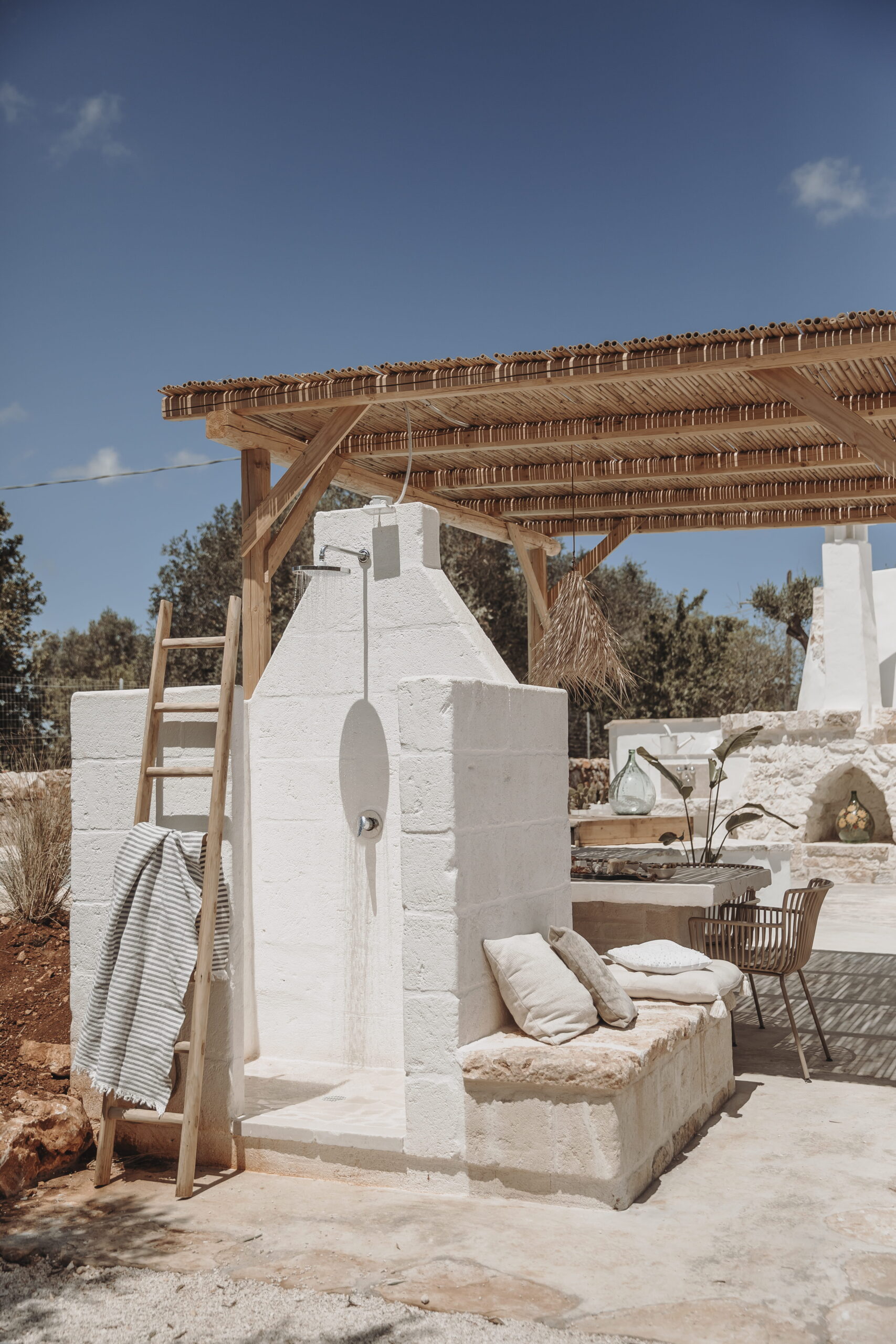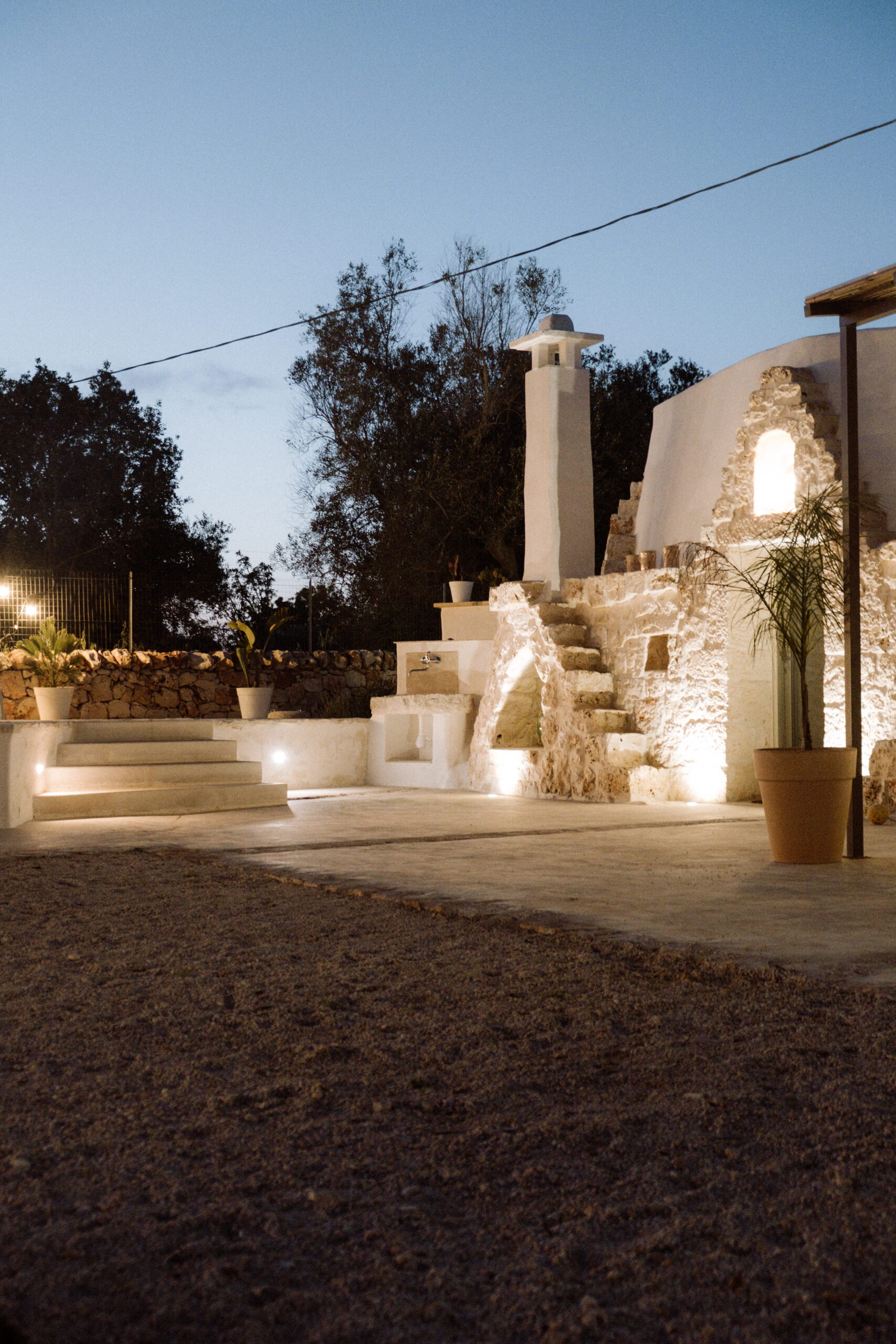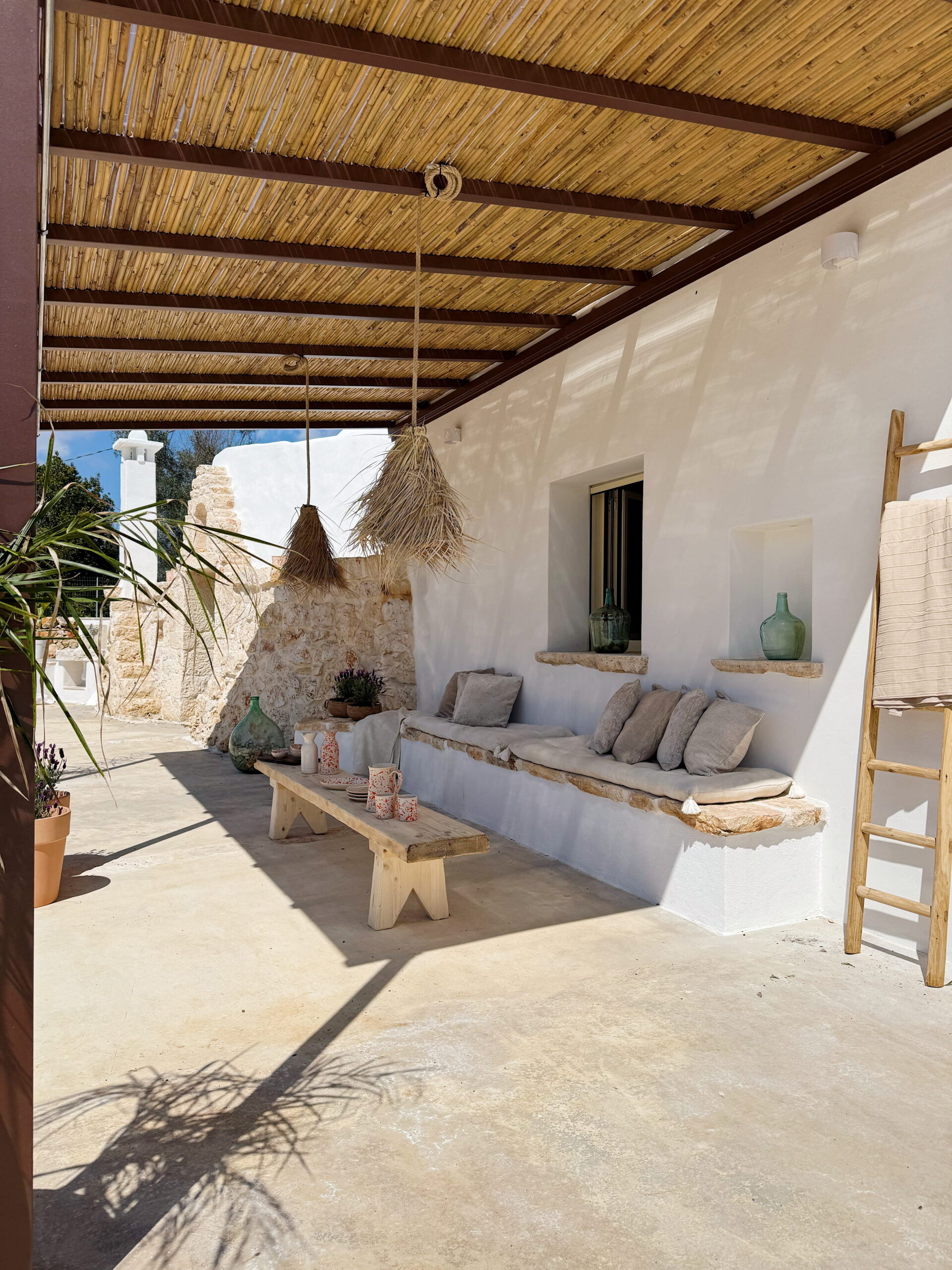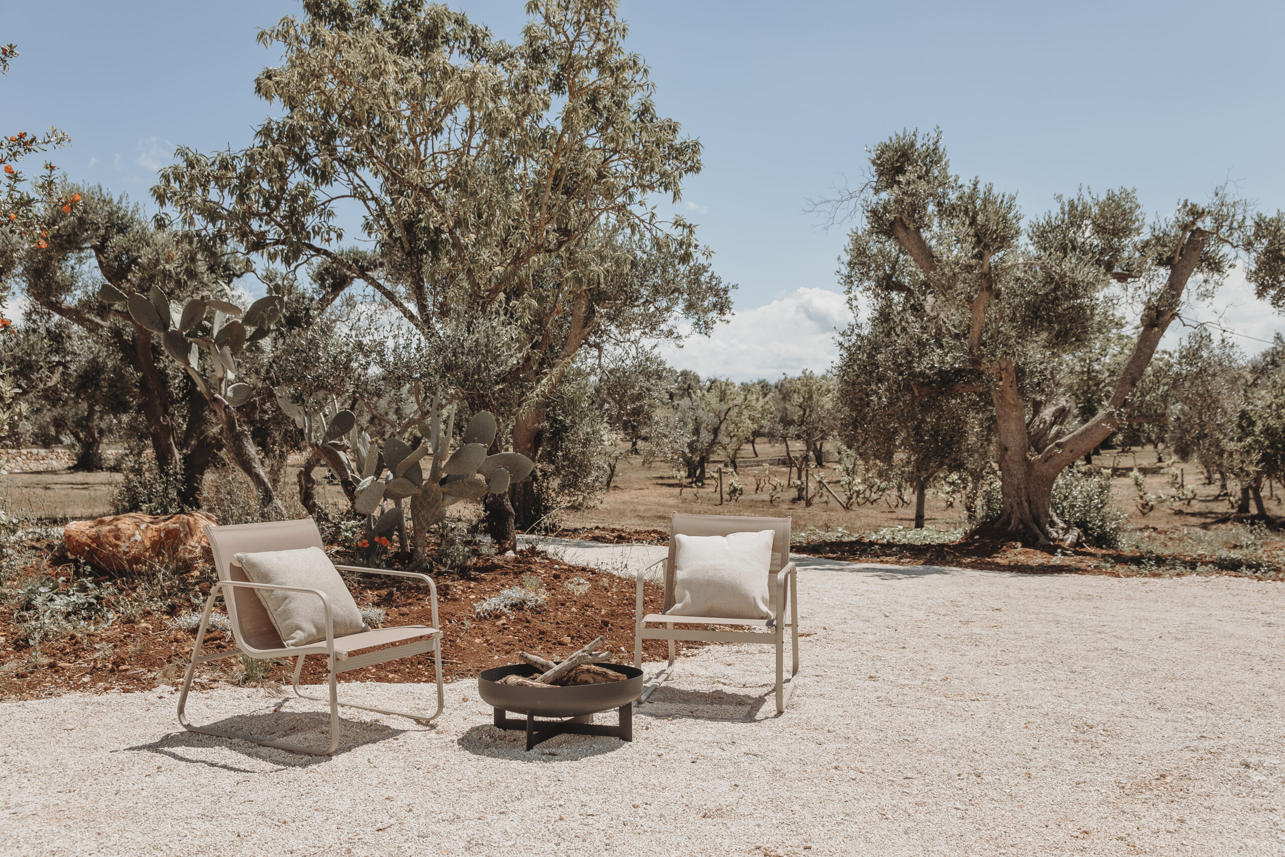 Buiten leef je het dolce vita zoals het bedoeld is. Pluk wat granaatappels van je eigen boom, dompel je onder in het zwembad (met apart ondiep gedeelte voor kleine gasten) of schenk een wijntje in bij de vuurkorf. Er is een loungehoek voor lome middagen, een buitenkeuken met authentieke stenen BBQ – waar je het heerlijke befaamde vlees van Valle d’Itria op kunt grillen – en genoeg hoekjes om je even terug te trekken met een boek of gewoon met het uitzicht.