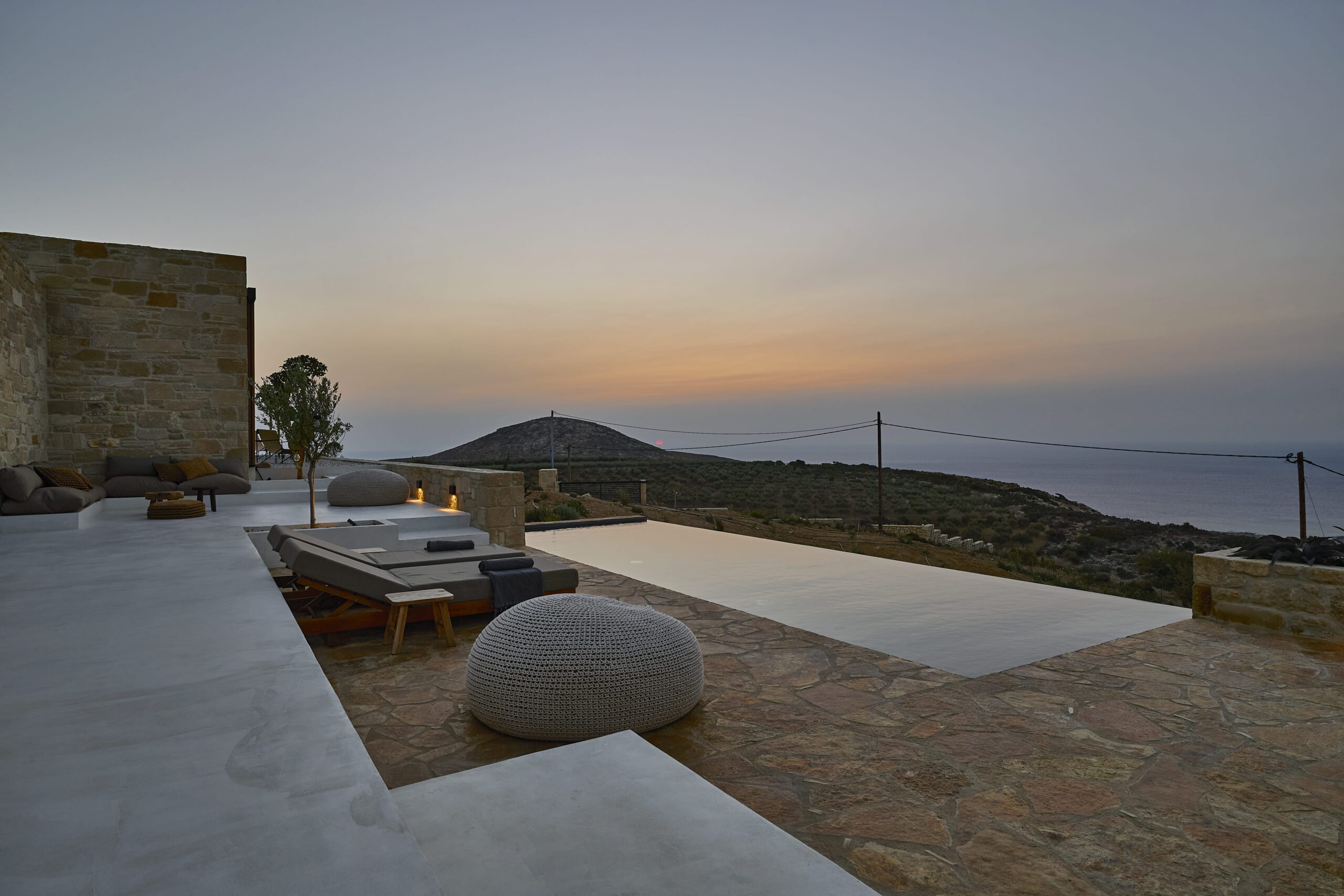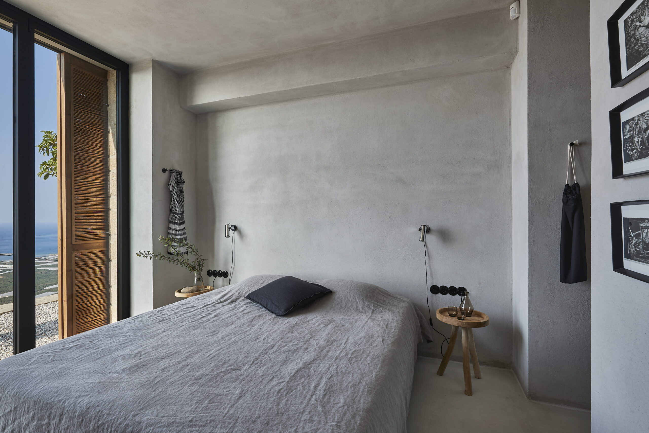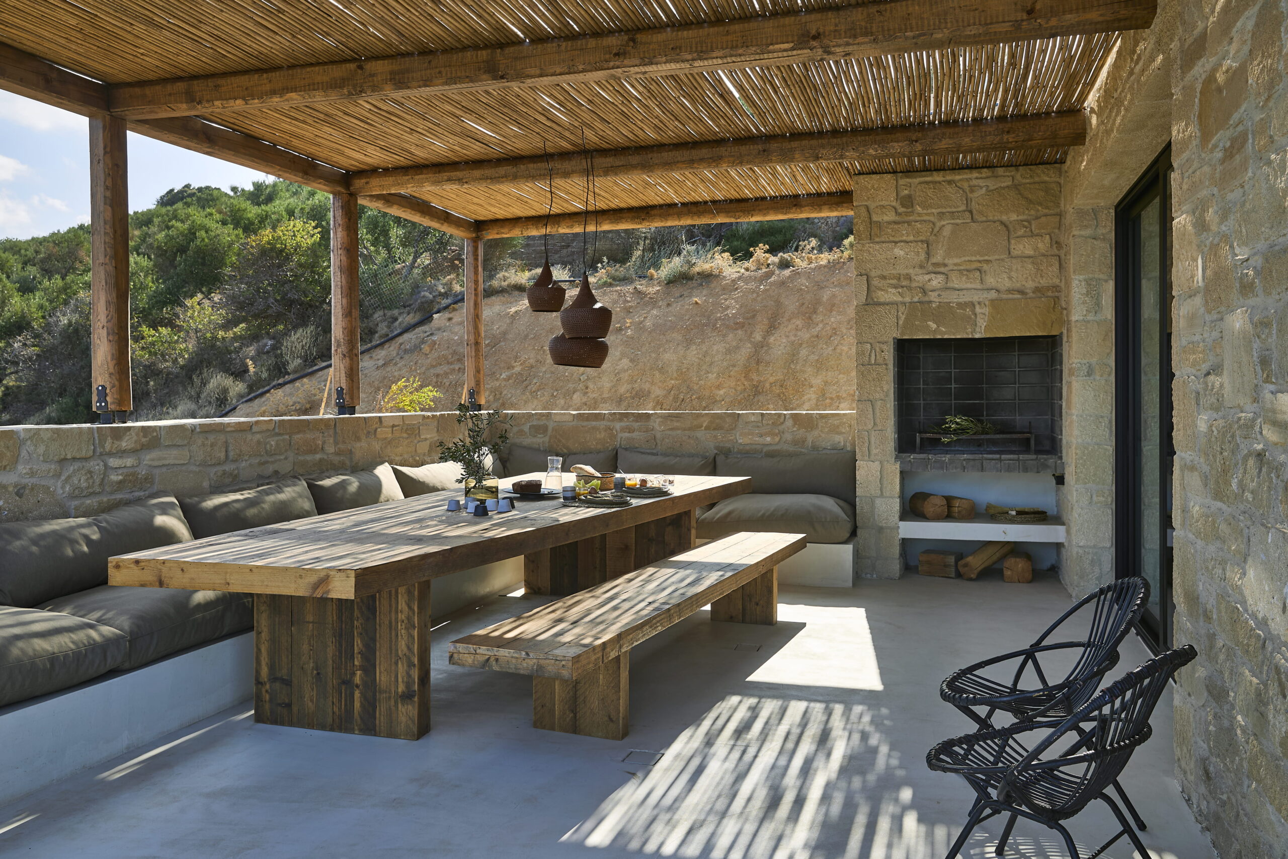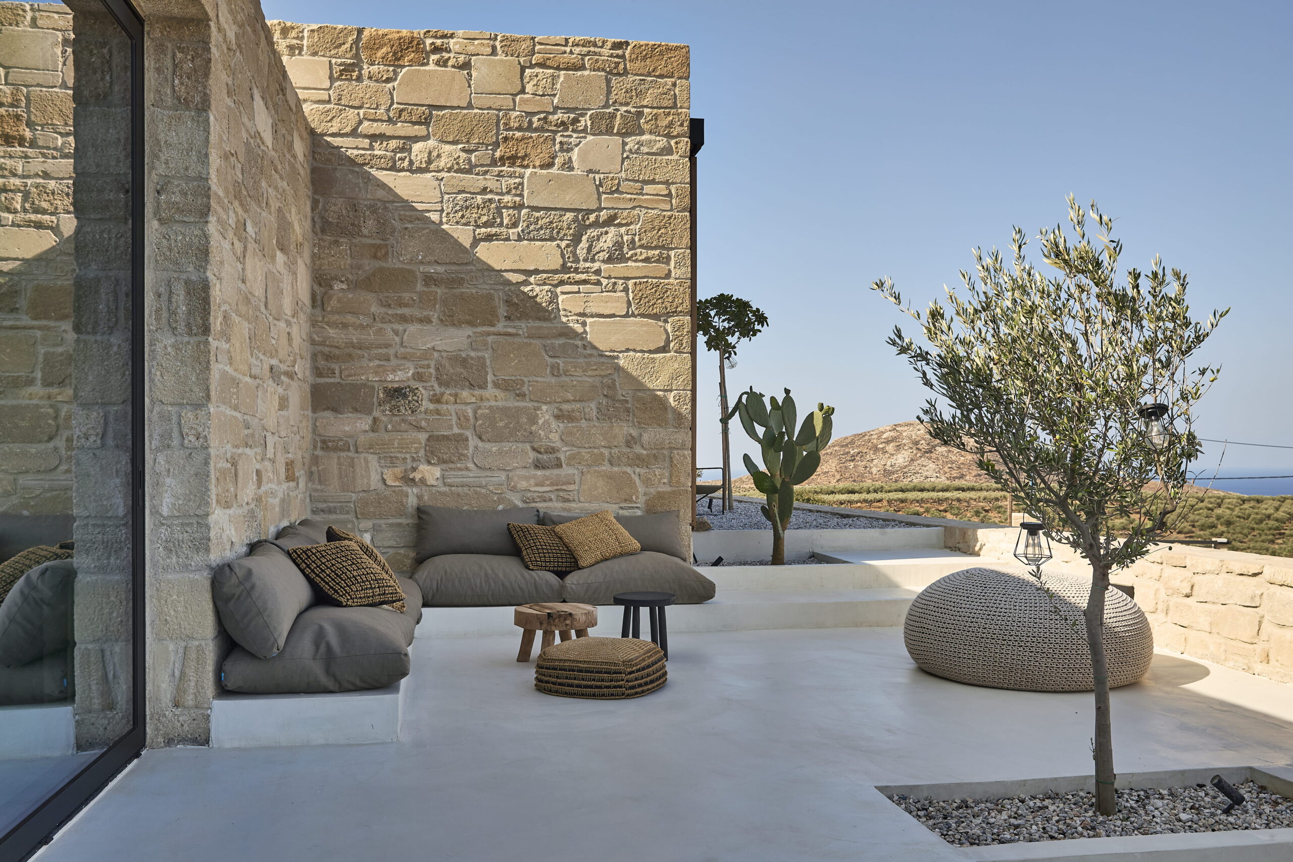 Van binnen is Metochi Lodge echt een plaatje! Denk aan gladgepolijste vloeren, ruwe muren en materialen die zo uit de natuur lijken geplukt. Alles ademt rust, maar met een boho twist: zelfgemaakt keramiek, zachte aardetinten met hier en daar een vleugje grijs of zandkleur en buitenmeubels van zwerfhout. De Belgische eigenaren voegden nog luxe extra’s toe met hoogwaardige Libeco-linnen lakens en natuurlijke badproducten van Rainpharma. Hier voel je de verbinding met de natuur in elk detail.