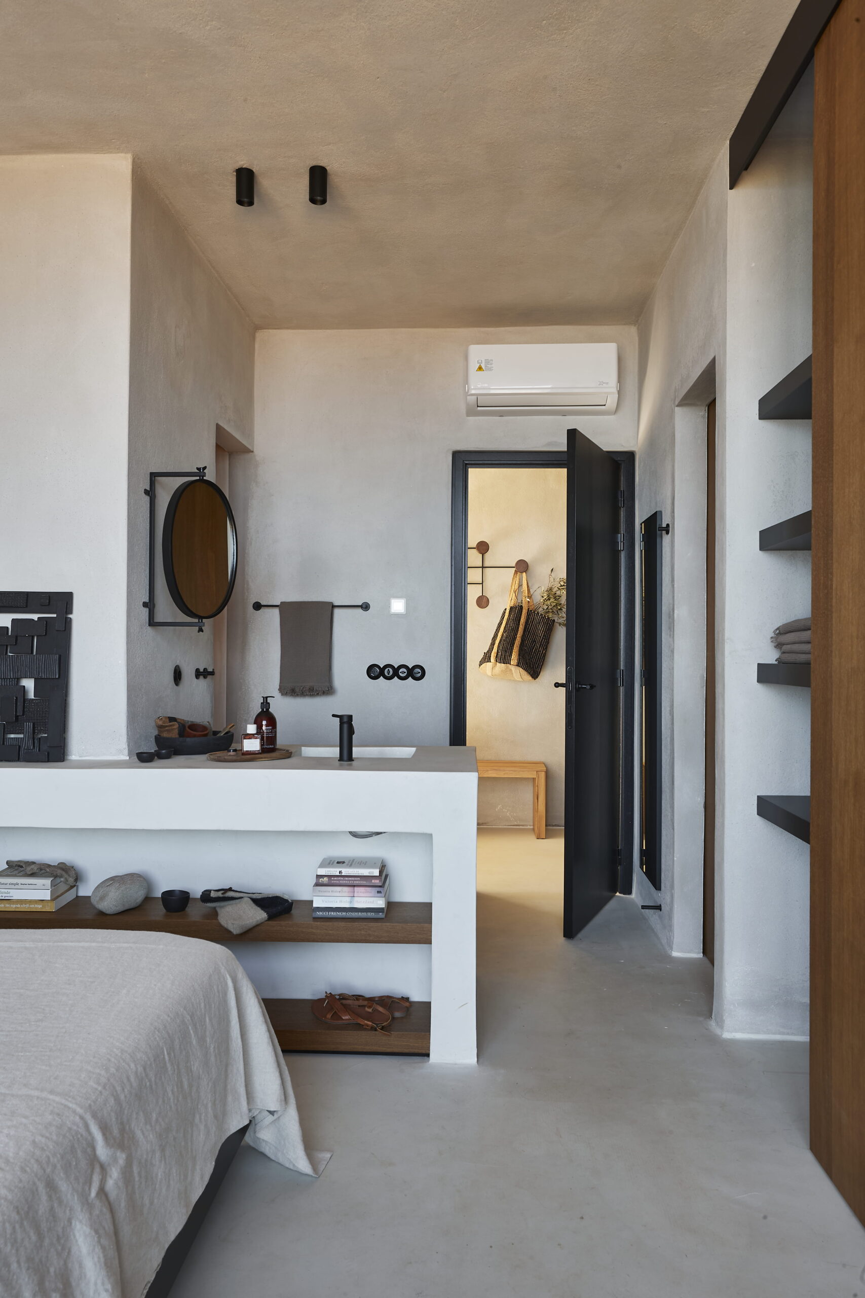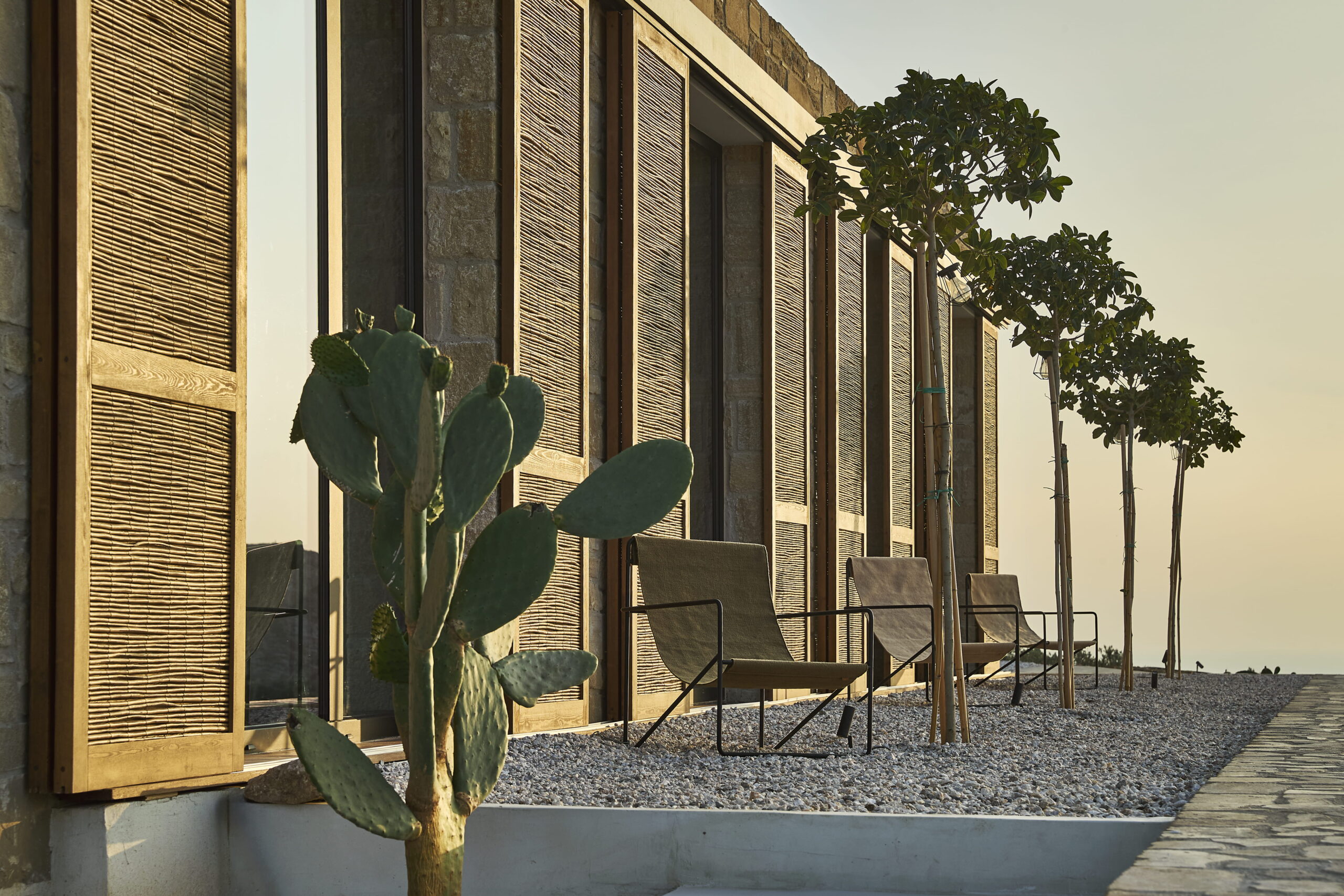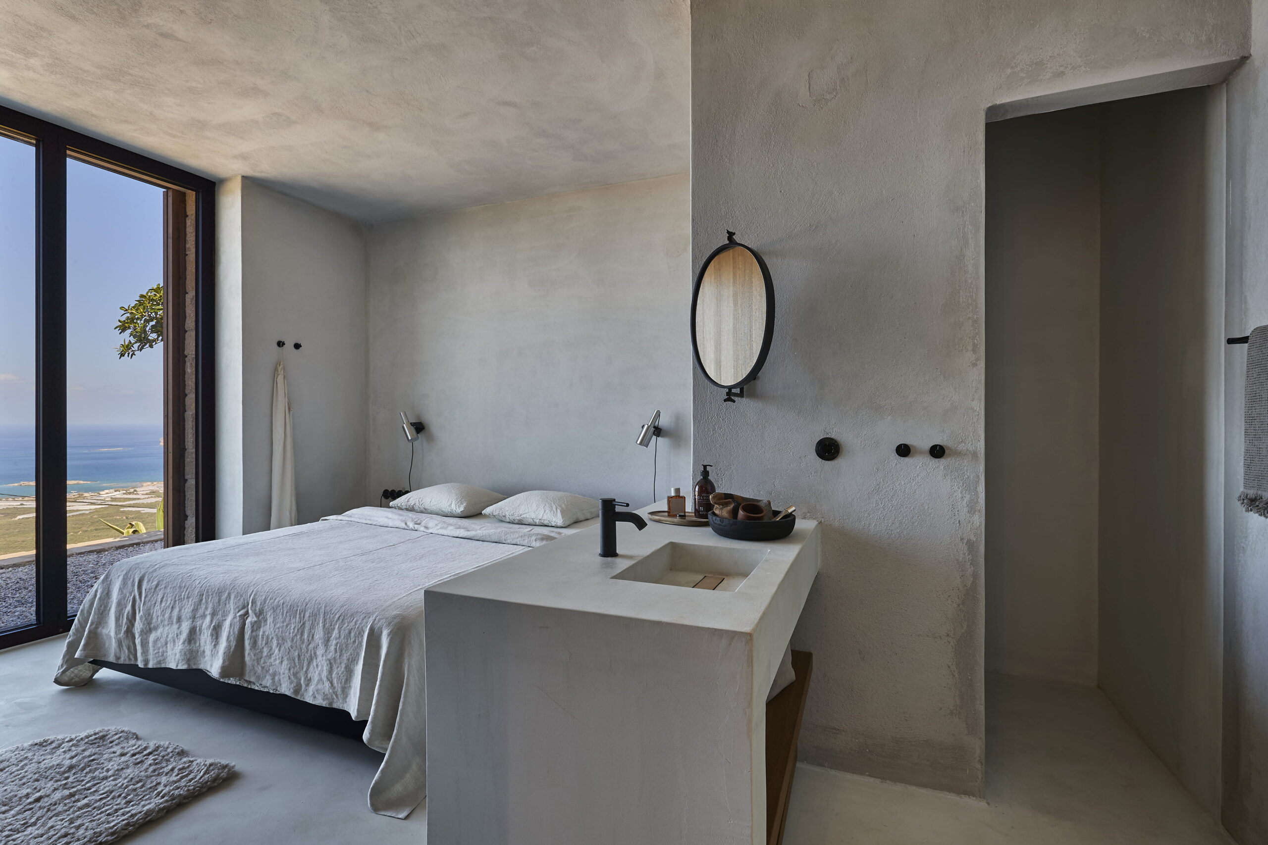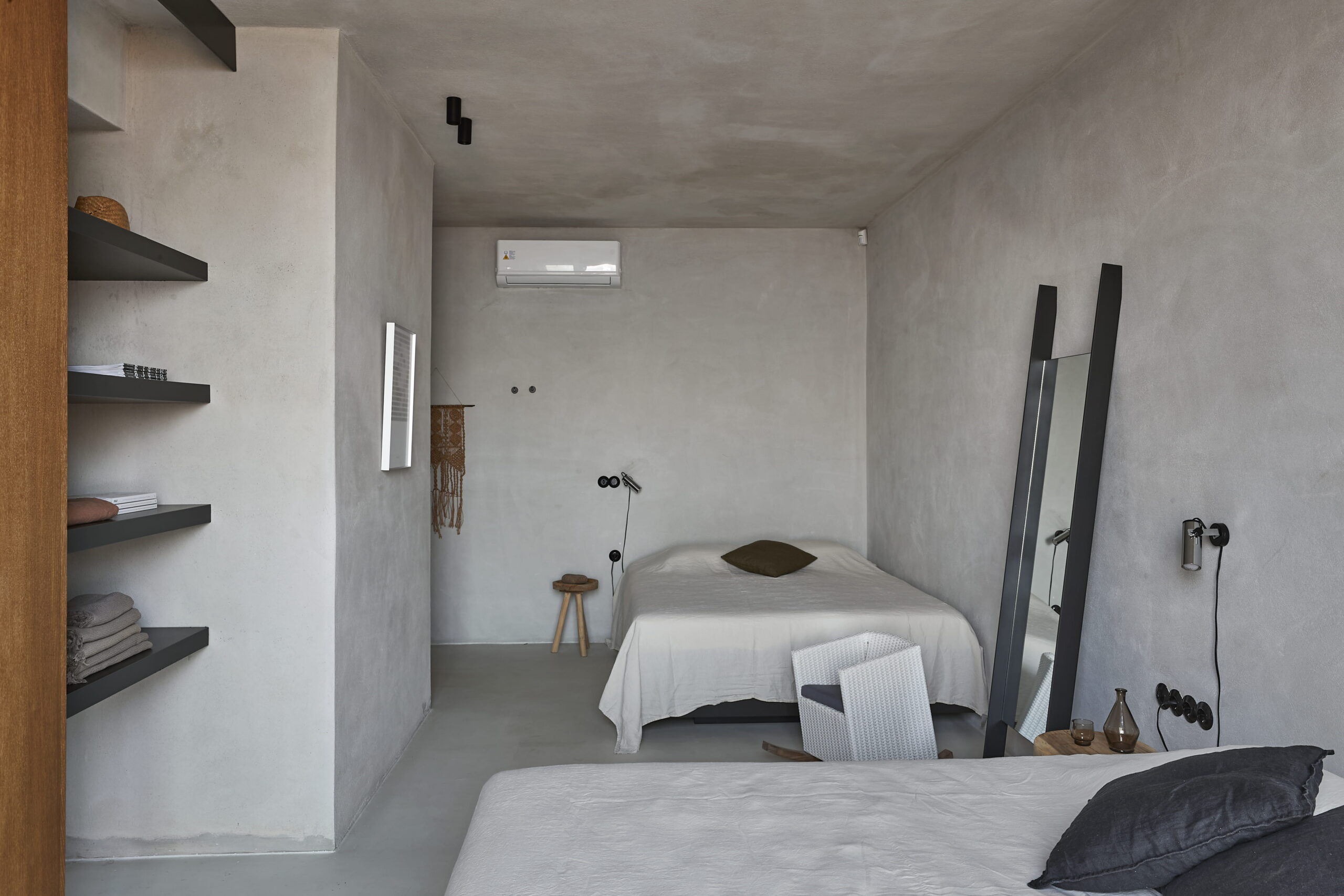 Van binnen is Metochi Lodge echt een plaatje! Denk aan gladgepolijste vloeren, ruwe muren en materialen die zo uit de natuur lijken geplukt. Alles ademt rust, maar met een boho twist: zelfgemaakt keramiek, zachte aardetinten met hier en daar een vleugje grijs of zandkleur en buitenmeubels van zwerfhout. De Belgische eigenaren voegden nog luxe extra’s toe met hoogwaardige Libeco-linnen lakens en natuurlijke badproducten van Rainpharma. Hier voel je de verbinding met de natuur in elk detail.