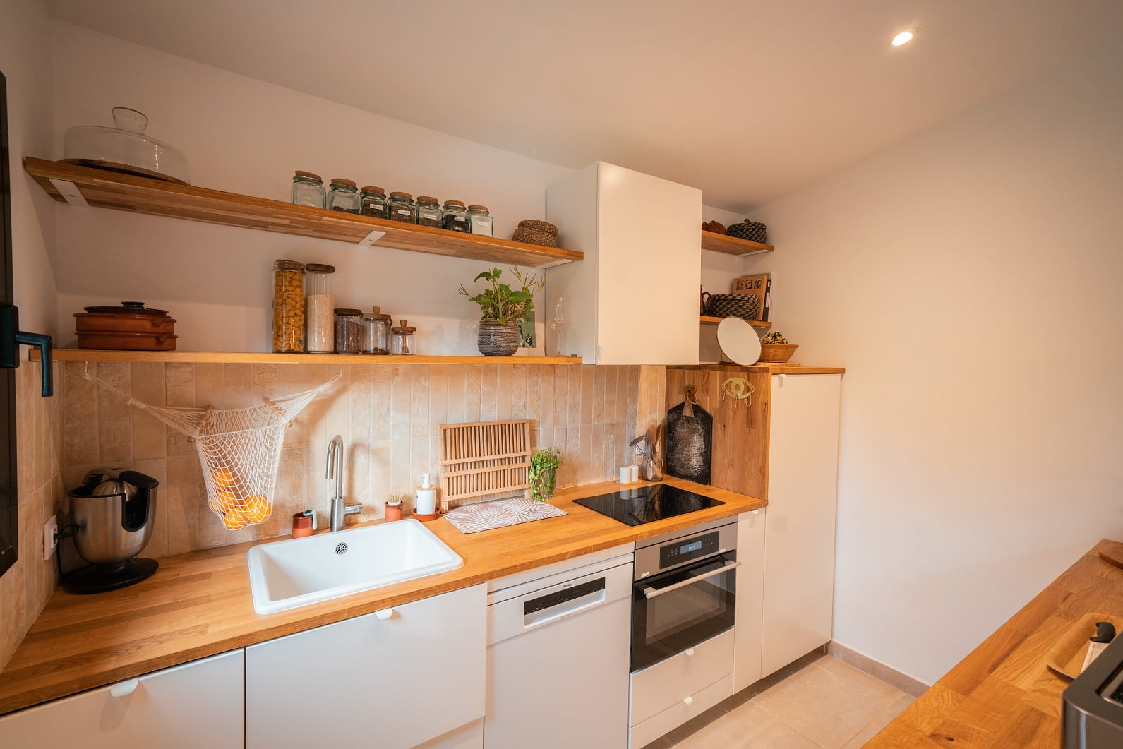 De open keuken heeft alles wat je nodig hebt om tijdens je vakantie lekkere maaltijden te bereiden. Het vakantiehuis heeft twee tweepersoonsslaapkamers en een kinderkamer met een stapelbed of tweepersoonsbed, afhankelijk van de setting van het gezelschap. De badkamer heeft ook weer zo’n heerlijke rustieke look. Een tweede badkamer verstopt zich in de kelder die vanaf buiten bereikbaar is. Praktisch als er veel mensen zijn, maar ook voor een snelle douche na een bezoekje aan het strand!