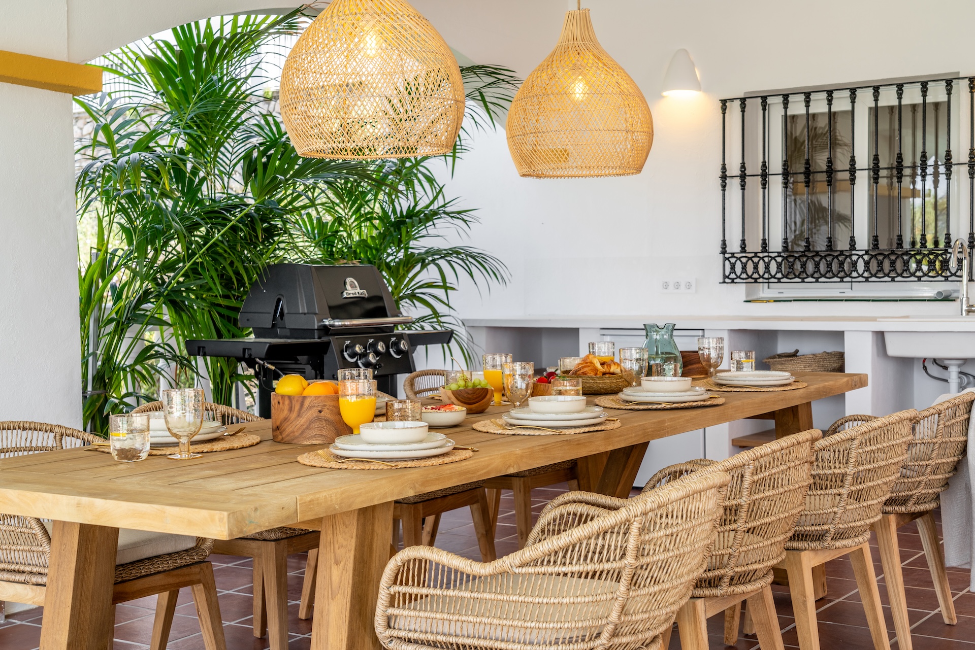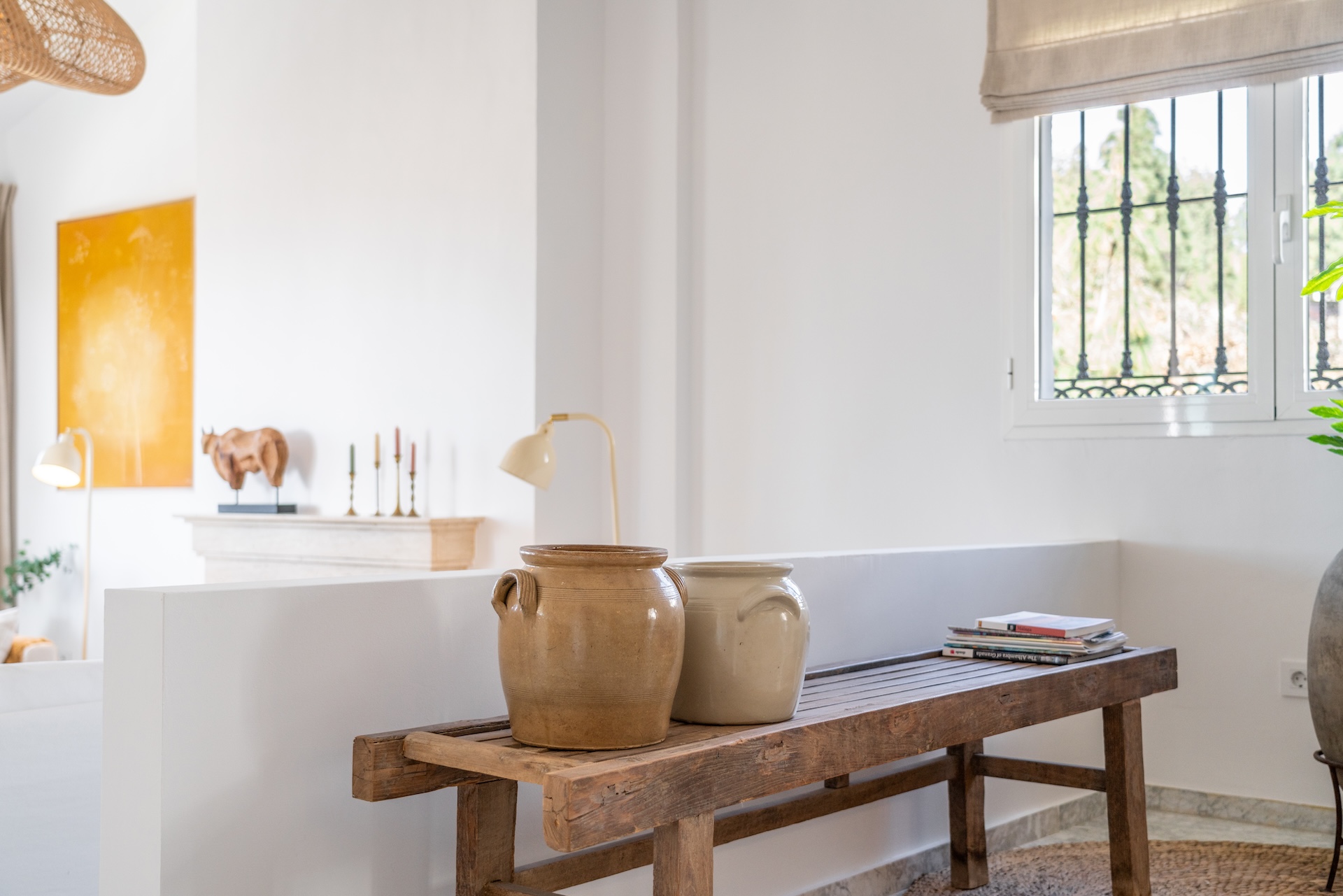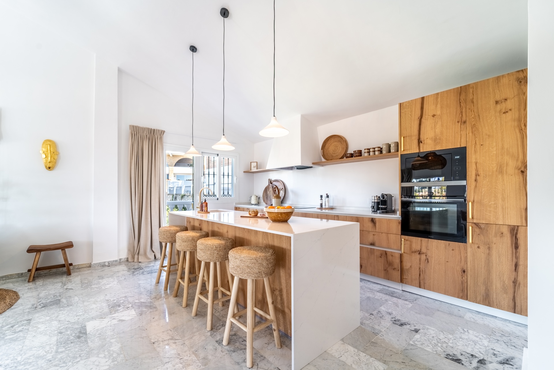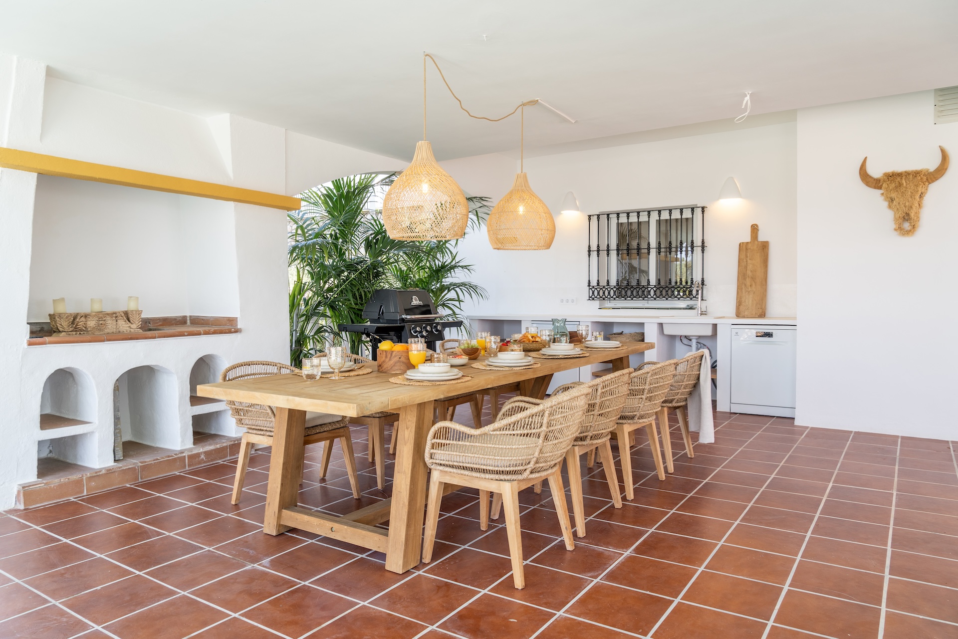 De villa ligt in de bergen. Dat betekent dus prachtig uitzicht op de natuur vanuit de verschillende buitenterrassen. Ons lievelingsplekje van Villa Solazul? Daar kunnen we kort over zijn: de houten lange eettafel onder de veranda, met uitzicht op het zwembad. Er is plek genoeg om de tafel te vullen met Jamón Ibérico, patatas bravas en calamares. Een barbecue staat hier uiteraard tot je beschikking, want wat is een Spaanse vakantievilla nou zonder goede barbecue? Juist. Mocht het weer onverhoopt toch een keer tegenzitten, niet getreurd: er is een goed uitgeruste binnen keuken mét kookeiland waar het ook heerlijk vertoeven is op de knappe houten barkrukken.
